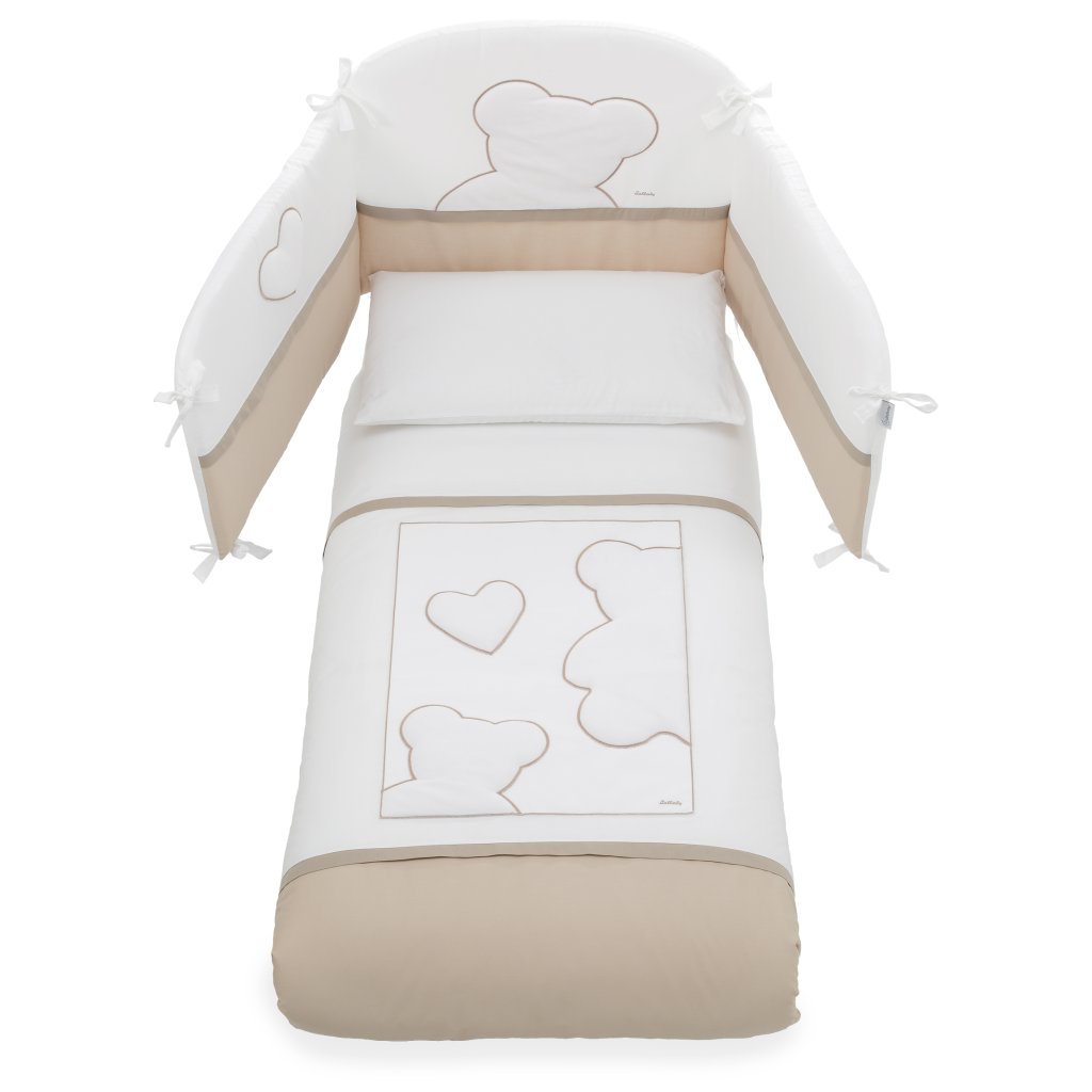 Kompletný 5 dielny set obsahuje: mantinel, paplónik + návliečku, návliečku na vankúšik a bavlnenú bielu plachtu na matrac. Textilné sety do postieľky od talianského výrobcu Italbaby sú vysoko kvalitné z veľmi príjemného materiálu zamerané na precízne spracovanie každého detailu. Produkty značky Italbaby sú bezpečné, certifikované a vyrábajú sa podľa bezpečnostných noriem priamo v Taliansku.