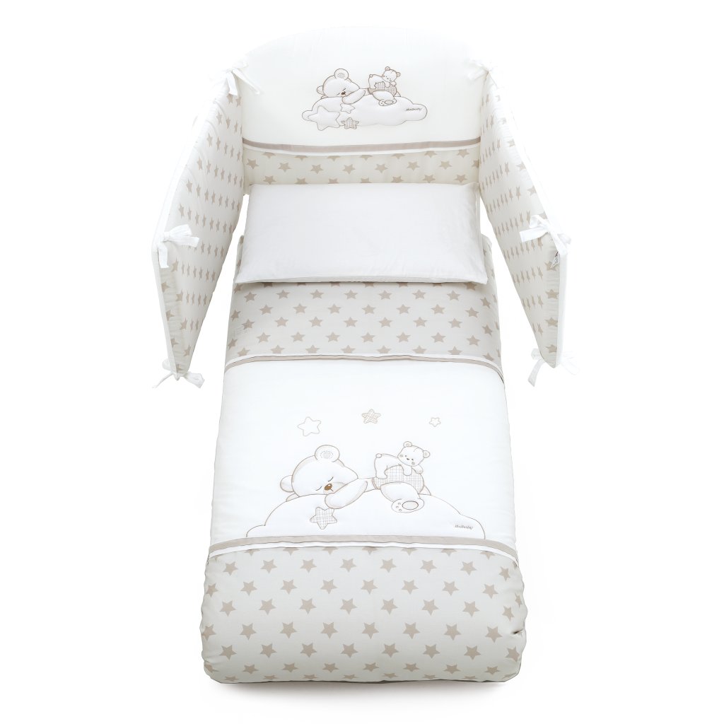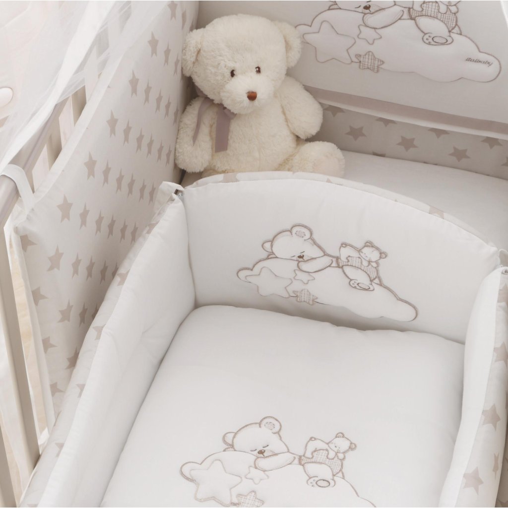 Kompletný 5 dielny set obsahuje: mantinel, paplónik + návliečku, návliečku na vankúšik a bavlnenú bielu plachtu na matrac. Textilné sety do postieľky od talianského výrobcu Italbaby sú vysoko kvalitné z veľmi príjemného materiálu zamerané na precízne spracovanie každého detailu. Produkty značky Italbaby sú bezpečné, certifikované a vyrábajú sa podľa bezpečnostných noriem priamo v Taliansku.