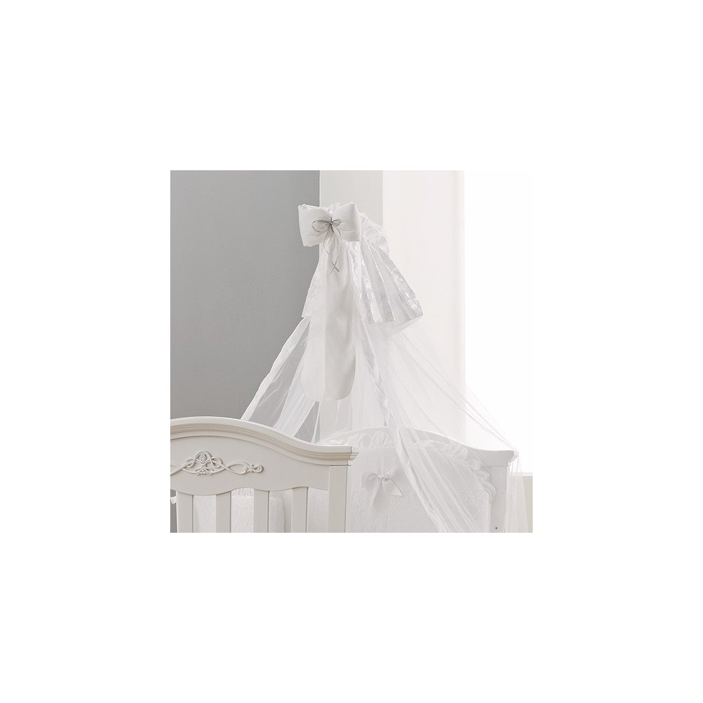Elegantný tylový baldachýn s držiakom s rýchlo upínacím systémom na detskú postieľku. Baldachýn je elegantný doplnok, vďaka ktorému bude detská postieľka útulnejšia a dieťa sa bude cítiť bezpečnejšie. Baldachýn chráni dieťa pred prievanom, muchami a komármi.