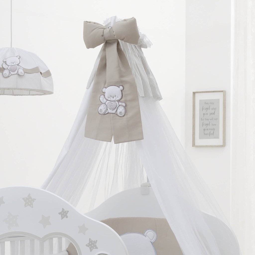 Elegantný tylový baldachýn s držiakom s rýchlo upínacím systémom na detskú postieľku. Baldachýn je elegantný doplnok, vďaka ktorému bude detská postieľka útulnejšia a dieťa sa bude cítiť bezpečnejšie. Baldachýn chráni dieťa pred prievanom, muchami a komármi.