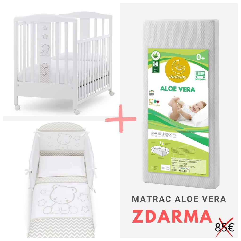 Italbaby detská postieľka so spúšťacím bokom Pop Star s komplet výbavou biela/béžová + matrac ZDARMA
