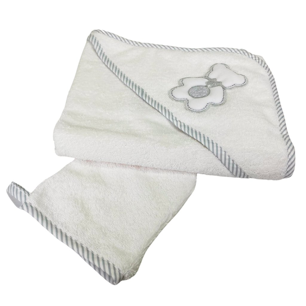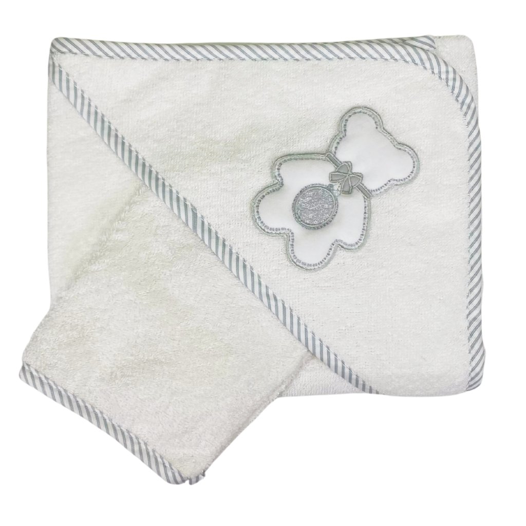 Bavlnená froté osuška pre novorodenca s kapucňou a žinkou v darčekovej krabičke. Osušku zdobí krásny medvedík Peluche. Vyrobené zo 100% certifikovanej príjemnej bavlny v Taliansku, ktorá nedráždi citlivú detskú pokožku a preto je ideálna pre bábätká. Osuška dieťa po kúpaní zahreje a kapucňa chráni mokrú hlavičku dieťaťa pred chladom. Produkty Italbaby sú certifikované a vyrábané v Taliansku podľa bezpečnostných noriem. Je ideálna ako darček.