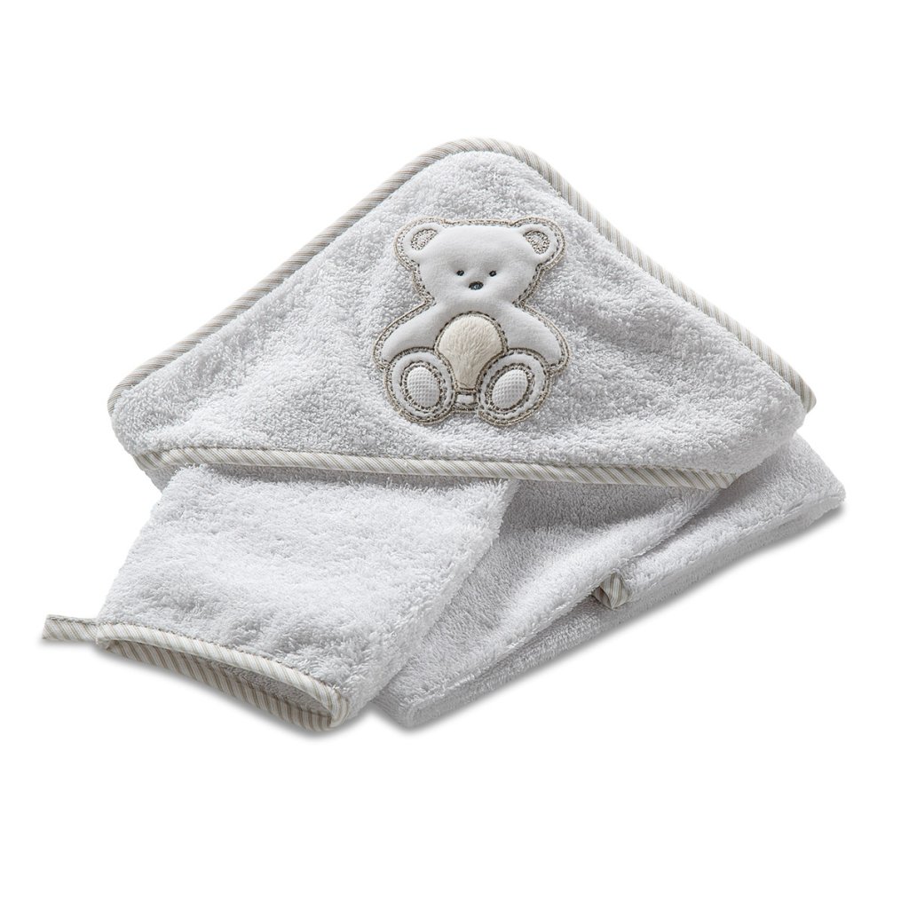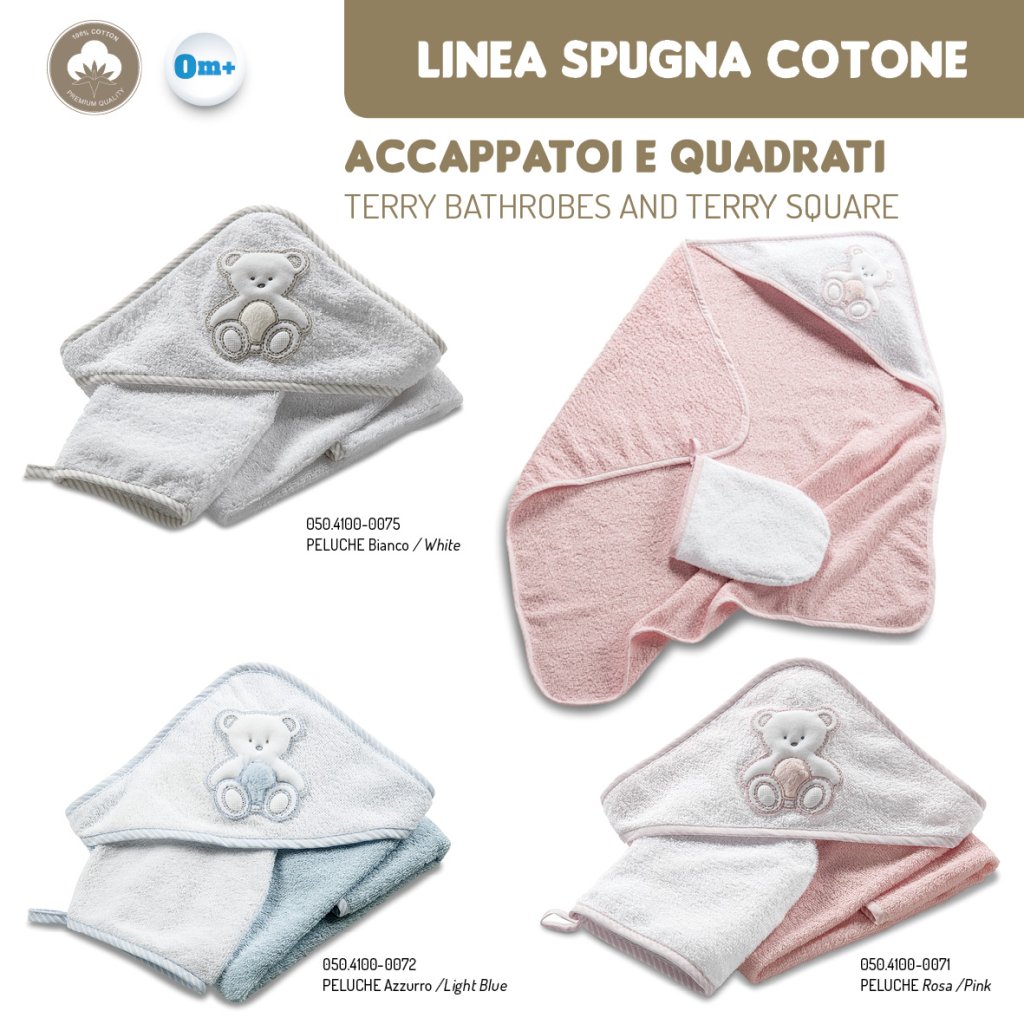 Bavlnená froté osuška pre novorodenca s kapucňou a žinkou v darčekovej krabičke. Osušku zdobí krásny medvedík Peluche. Vyrobené zo 100% certifikovanej príjemnej bavlny v Taliansku, ktorá nedráždi citlivú detskú pokožku a preto je ideálna pre bábätká. Osuška dieťa po kúpaní zahreje a kapucňa chráni mokrú hlavičku dieťaťa pred chladom. Produkty Italbaby sú certifikované a vyrábané v Taliansku podľa bezpečnostných noriem. Je ideálna ako darček.