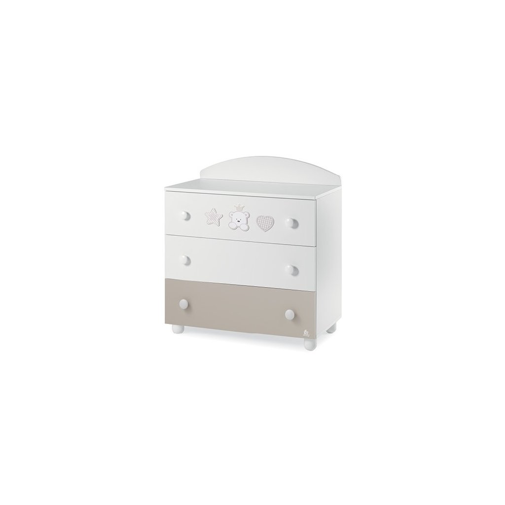 Praktická detská komoda s 3 priestrannými zásuvkami. Ku komode odporúčame dokúpiť prebaľovaciu podložku alebo externý drevený rám na PVC podložku.