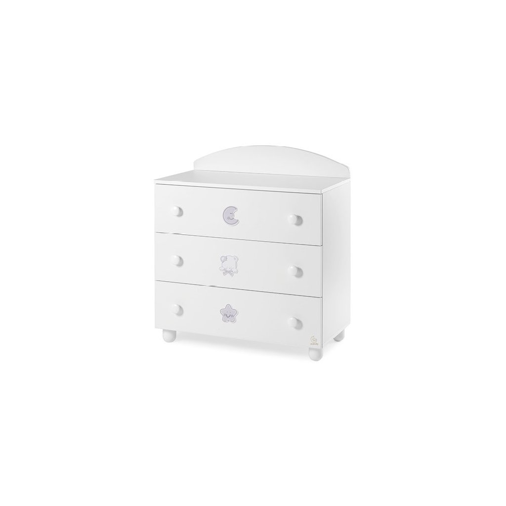 Praktická detská komoda s 3 priestrannými zásuvkami. Ku komode odporúčame dokúpiť prebaľovaciu podložku alebo externý drevený rám na PVC podložku.