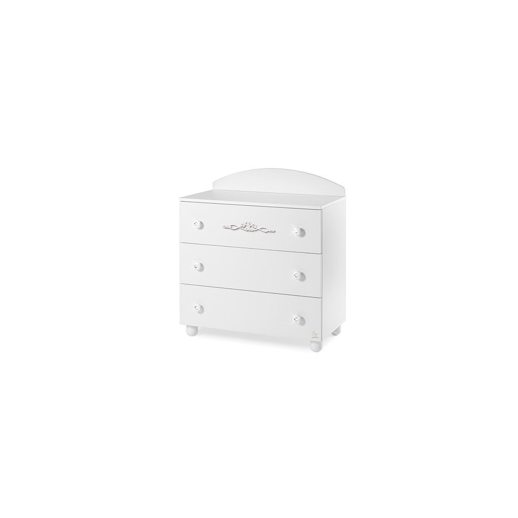 Praktická detská komoda s 3 priestrannými zásuvkami. Ku komode odporúčame dokúpiť prebaľovaciu podložku alebo externý drevený rám na PVC podložku.