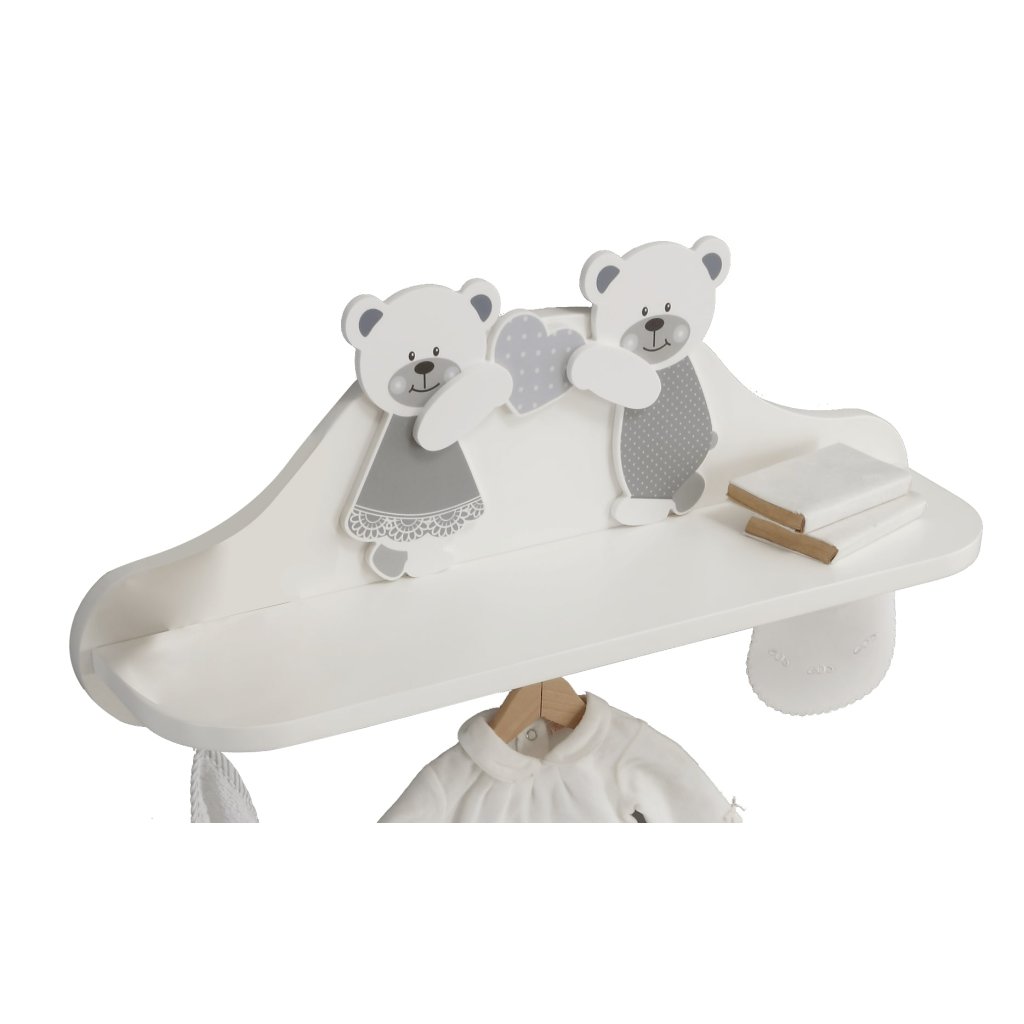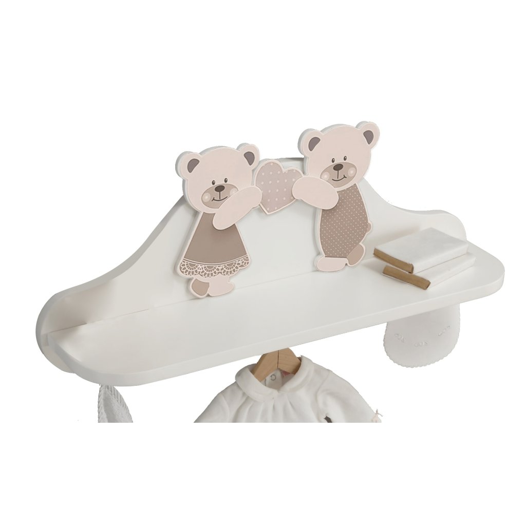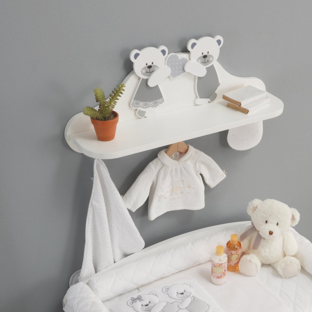 Detská polička so sladkými medvedíkmi, ktorá je veľmi užitočná ako doplnok a ozdoba každej detskej izbičky.