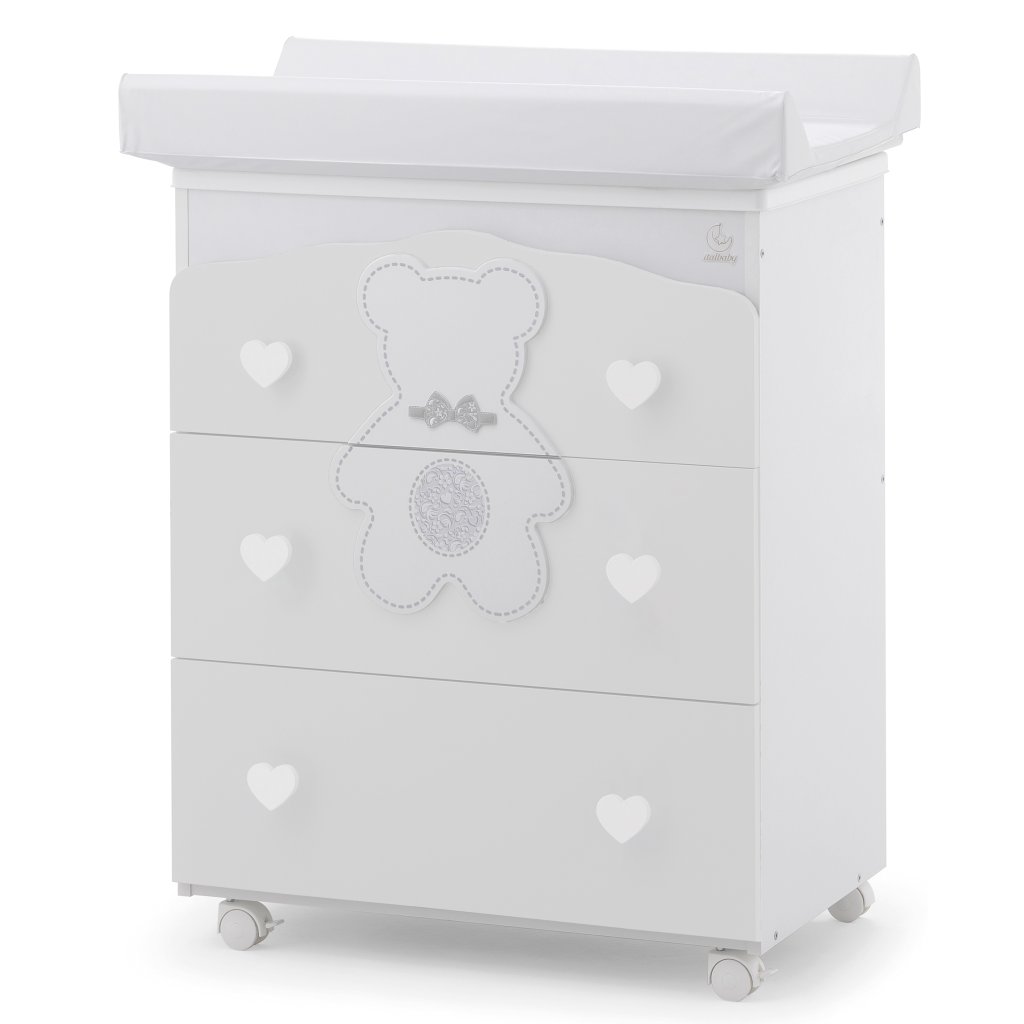 Pult je veľmi pevný a umožňuje pohodlné prebaľovanie až do 12 mesiacov bábätka. Na vrchnej časti pultu je mäkká PVC podložka v bielej farbe, ktorá je vybavená dvoma vyvýšenými bezpečnostnými stranami. PVC prebaľovacia podložka je na pocit chladná, preto odporúčame dokúpiť si bavlnený alebo froté poťah, resp. bavlnené mušelínové plienky, ktoré sú z príjemných a hrejivých materiálov, čím sa zabezpečí dokonalý komfort pri prebaľovaní bábätka. K prebaľovaciemu pultu si môžete doobjednať patentovaný systém Easy Dress (otáčanie prebaľovacej podušky), ktorý Vám zjednoduší prebaľovanie bábätka.