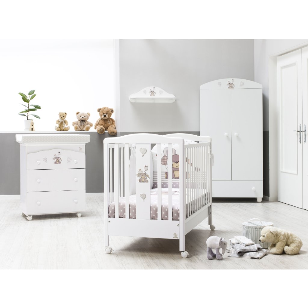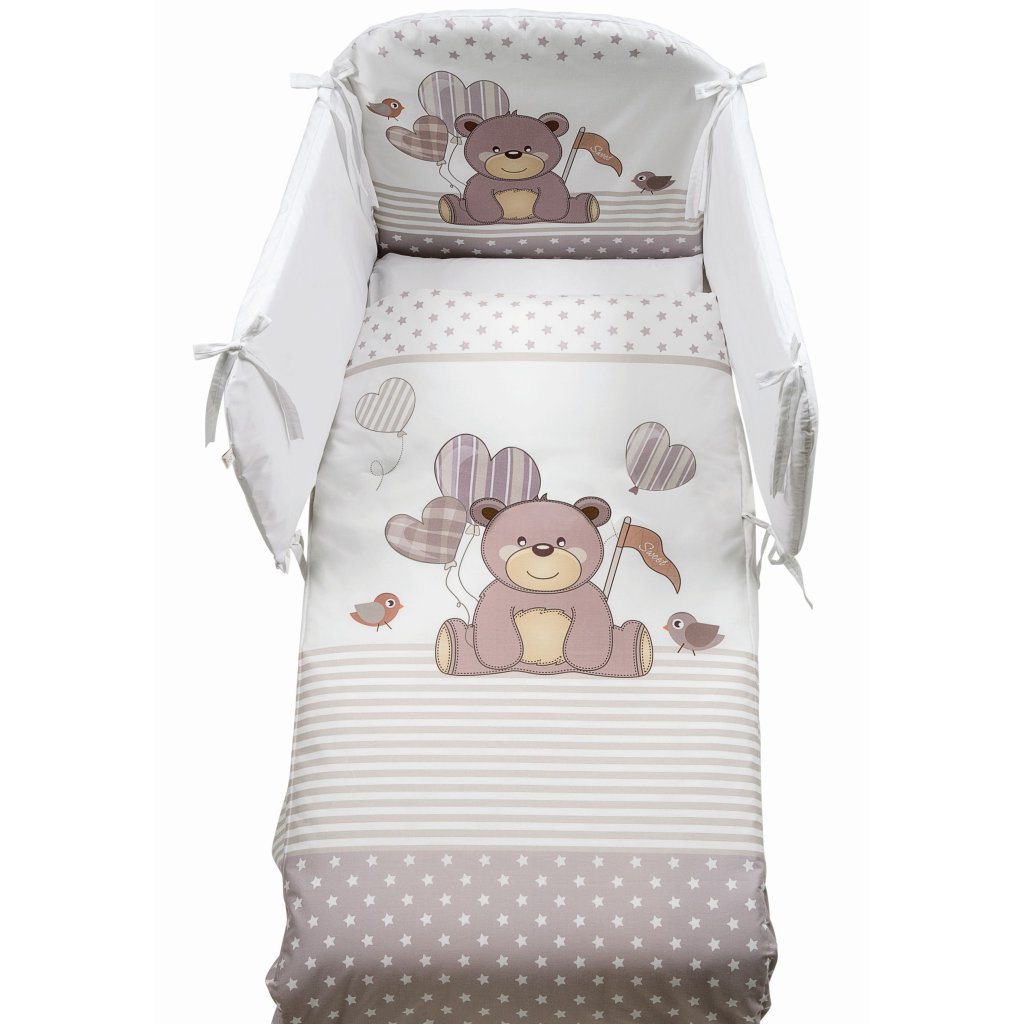 Kompletný 5 dielny set obsahuje: mantinel, paplónik + návliečku, plachtu na matrac a návliečku na vankúšik. 100% bavlna, vyrobené v Taliansku.
