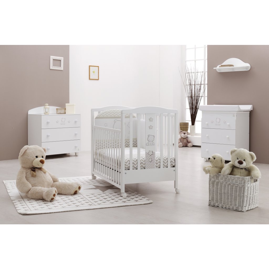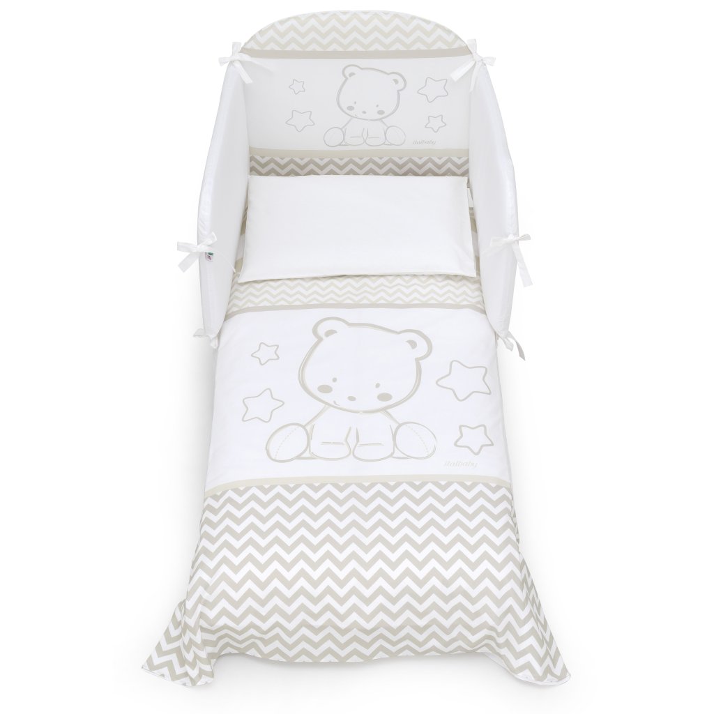 Kompletný 5 dielny set obsahuje: mantinel, paplónik + návliečku, plachtu na matrac a návliečku na vankúšik. 100% bavlna, vyrobené v Taliansku.