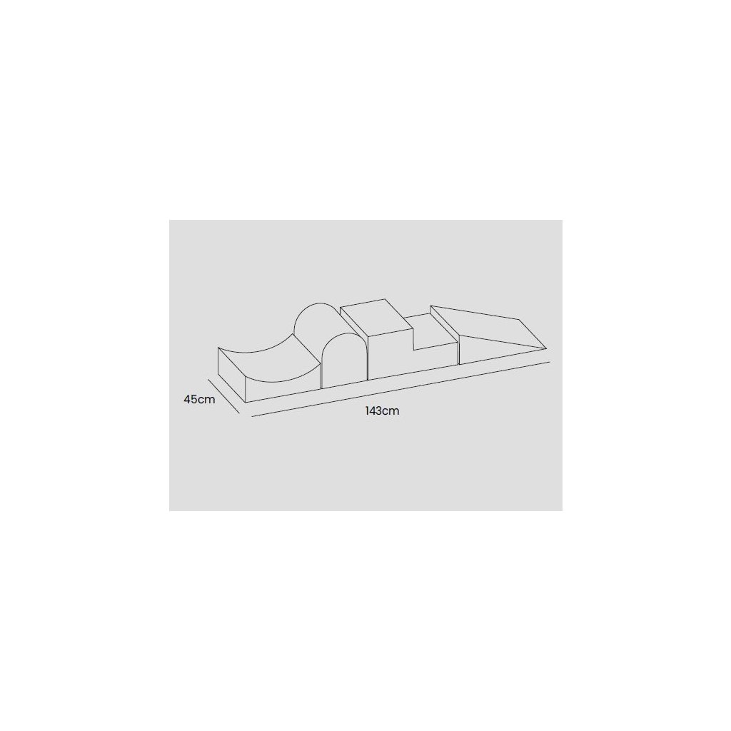 Hypoalergénna polyuretánová pena použitá pri výrobe súpravy sa vyznačuje nízkou hmotnosťou a vysokou odolnosťou proti deformácii, vďaka čomu je výrobok bezpečný pre deti a mimoriadne praktický. Bloky sú ľahké, takže sa dajú ľahko prestavať.Všetky prvky setu majú odnímateľné poťahy, čo uľahčuje pranie v práčke a udržiava prekážkovú dráhu čistú.