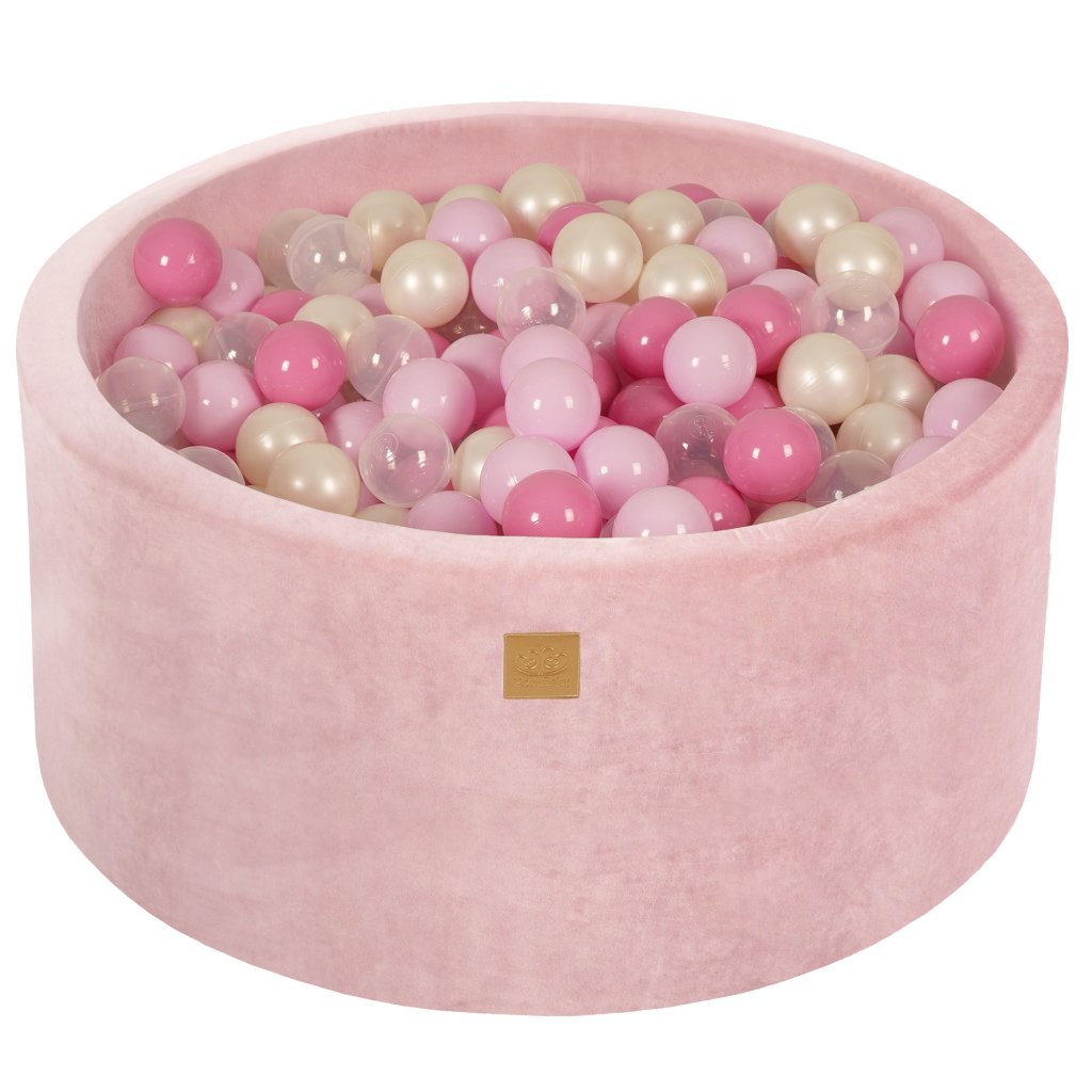 MeowBaby® Velvet detský suchý bazén s guličkami 90x40cm + 300 guličiek – ružová, guličky: bledoružová/ružová/transparentná/perleťová biela