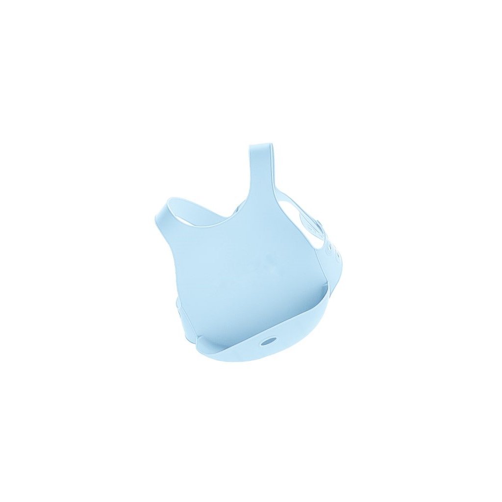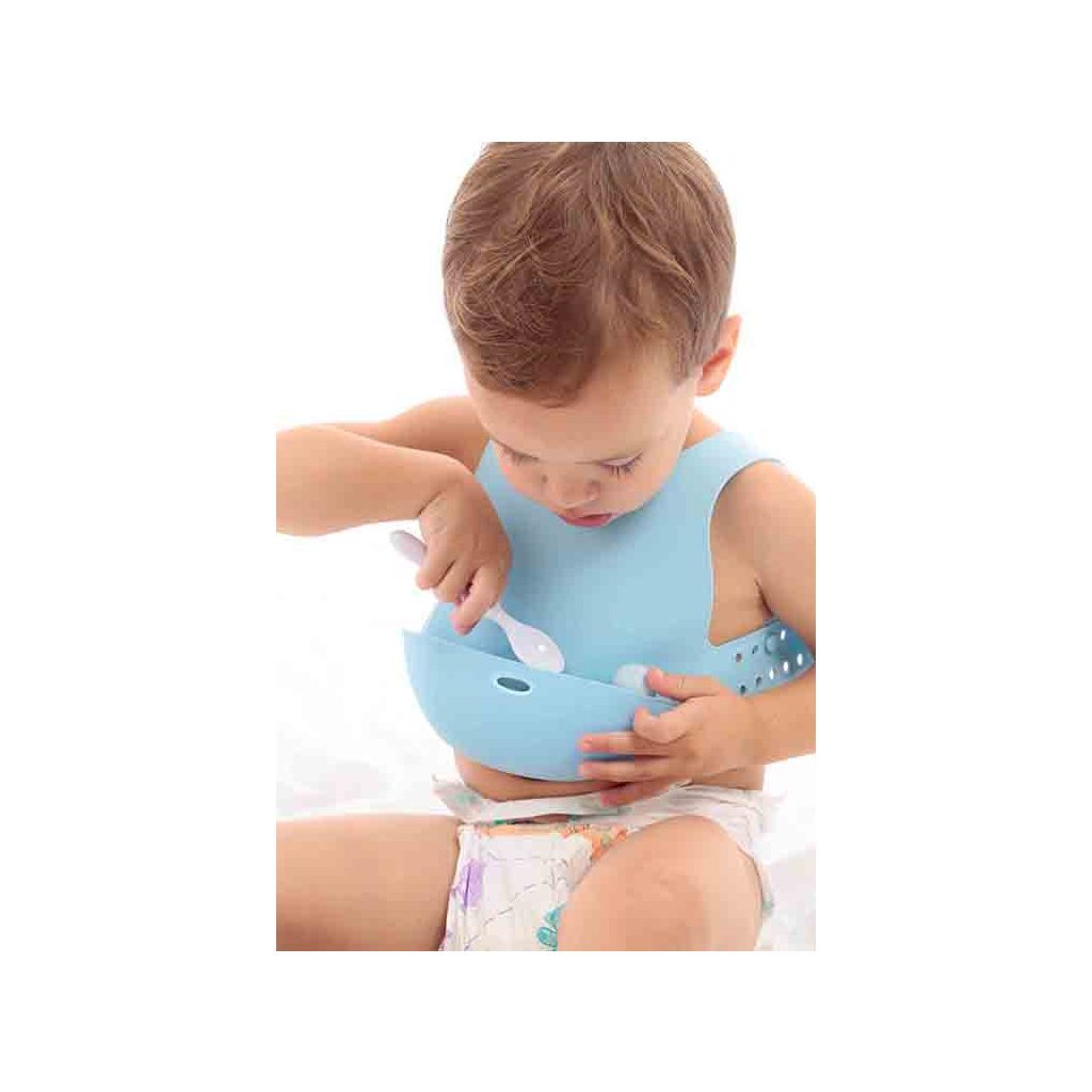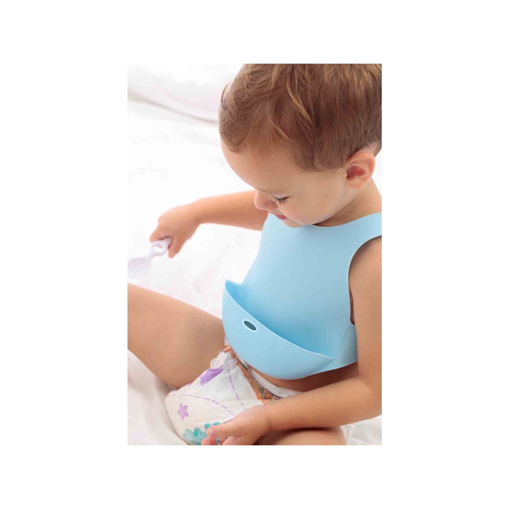 Detský silikónový podbradník s vreckom, ktorý zachytí väčšie kúsky jedla. Jedinečne navrhnuté pásy sú spojené v dolnej časti chrbta namiesto krku dieťaťa. Vhodné pre deti od 6 mesiacov do 4 rokov.