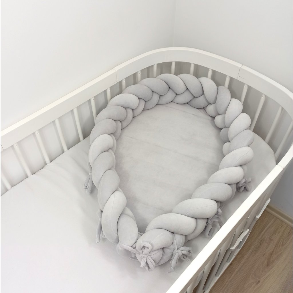 Toto multifunkčné pletené hniezdo ocení každá mamička. V prvých mesiacoch bábätka sa používa ako ochranné hniezdo a neskôr odopnutím ozdobných šnuriek získate pletený mantinel do postieľky. Ochranné hniezdo navodzuje bábätkám pocit bezpečia, dieťatko sa tak cíti spokojne ako u mamičky v brušku. Bábätku ďaleko lepšie zaspáva a je pokojnejšie. Farba: bledošedá, číslo vo vzorkovníku: 17.
