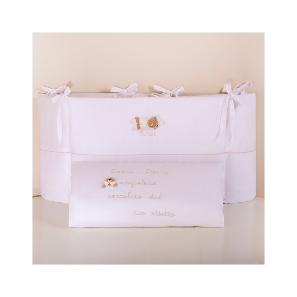 Doprajte svojmu bábätku dokonalé pohodlie s luxusnou 4-dielnou súpravou Nanán Tato v jemnej smotanovej farbe. Ideálna pre oválne postieľky, poskytuje bezpečný a pokojný spánok. Set obsahuje: ochranný mantinel, návliečku na vankúšik, návliečku na perinu a samotnú perinu. Vhodné do oválnej detskej postieľky s medvedíkom Tato v smotanovej farbe.