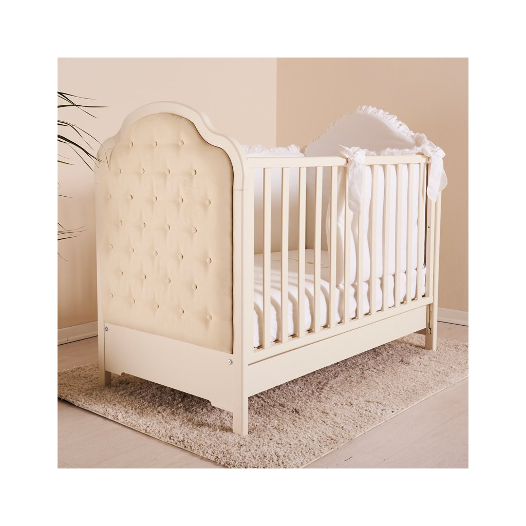 Luxusná detská postieľka Bon bon, romantická a elegantná, vyrobená z MDF dreva lakovaného netoxickou vodou riediteľnou farbou v súlade s európskymi normami. Je vybavená veľmi pohodlnou zásuvkou a bočným panelom s mechanizmom hore-dole. Každý komponent je venovaný celkovej bezpečnosti a pohodliu bábätka, lamely sú umiestnené tak, aby sa predišlo akémukoľvek nebezpečenstvu. Vonkajšie rozmery: 130 x 72 x 105V cm. Vhodný rozmer matraca 63x125cm.