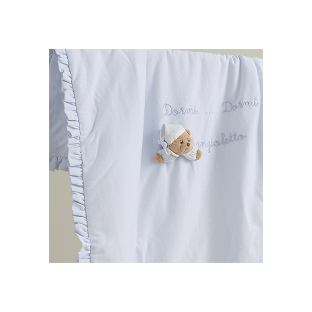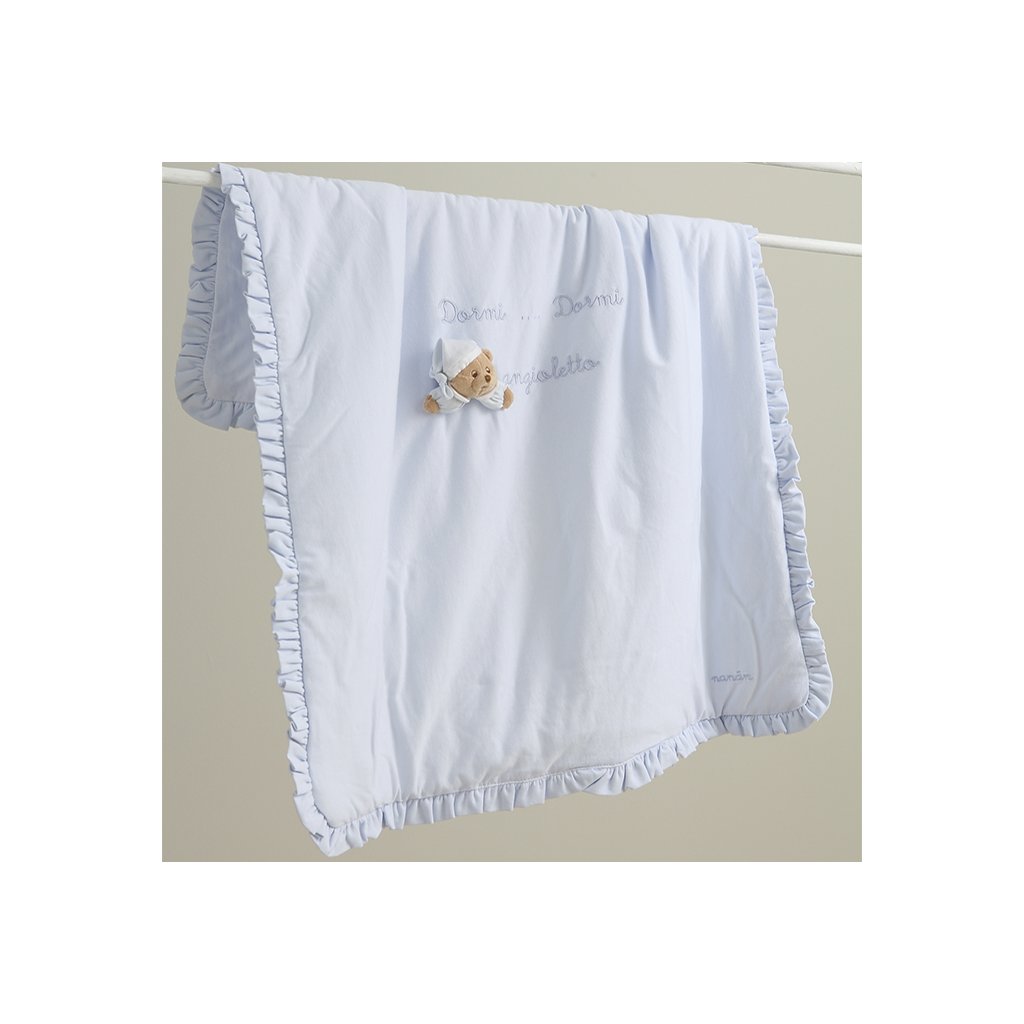 Kvalitná hebká bavlnená deka pre bábätko s volánikmi a dekoráciou nežného medvedíka kolekcie Puccio od talianskej prestížnej značky Nanán. Na výrobu je používaná luxusná bavlna s extra dlhými vláknami, vďaka čomu je neuveriteľne hladká, tenká, ľahučká a zároveň veľmi pevná. Svojou jemnosťou vás očarí! Má nielen luxusný vzhľad, ale má aj dlhšiu trvácnosť. Ideálna aj ako darček.