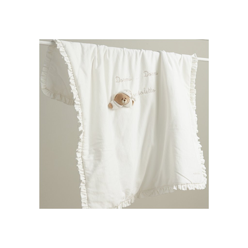 Kvalitná hebká bavlnená deka pre bábätko s volánikmi a dekoráciou nežného medvedíka kolekcie Tato od talianskej prestížnej značky Nanán. Na výrobu je používaná luxusná bavlna s extra dlhými vláknami, vďaka čomu je neuveriteľne hladká, tenká, ľahučká a zároveň veľmi pevná. Svojou jemnosťou vás očarí! Má nielen luxusný vzhľad, ale má aj dlhšiu trvácnosť. Ideálna aj ako darček.