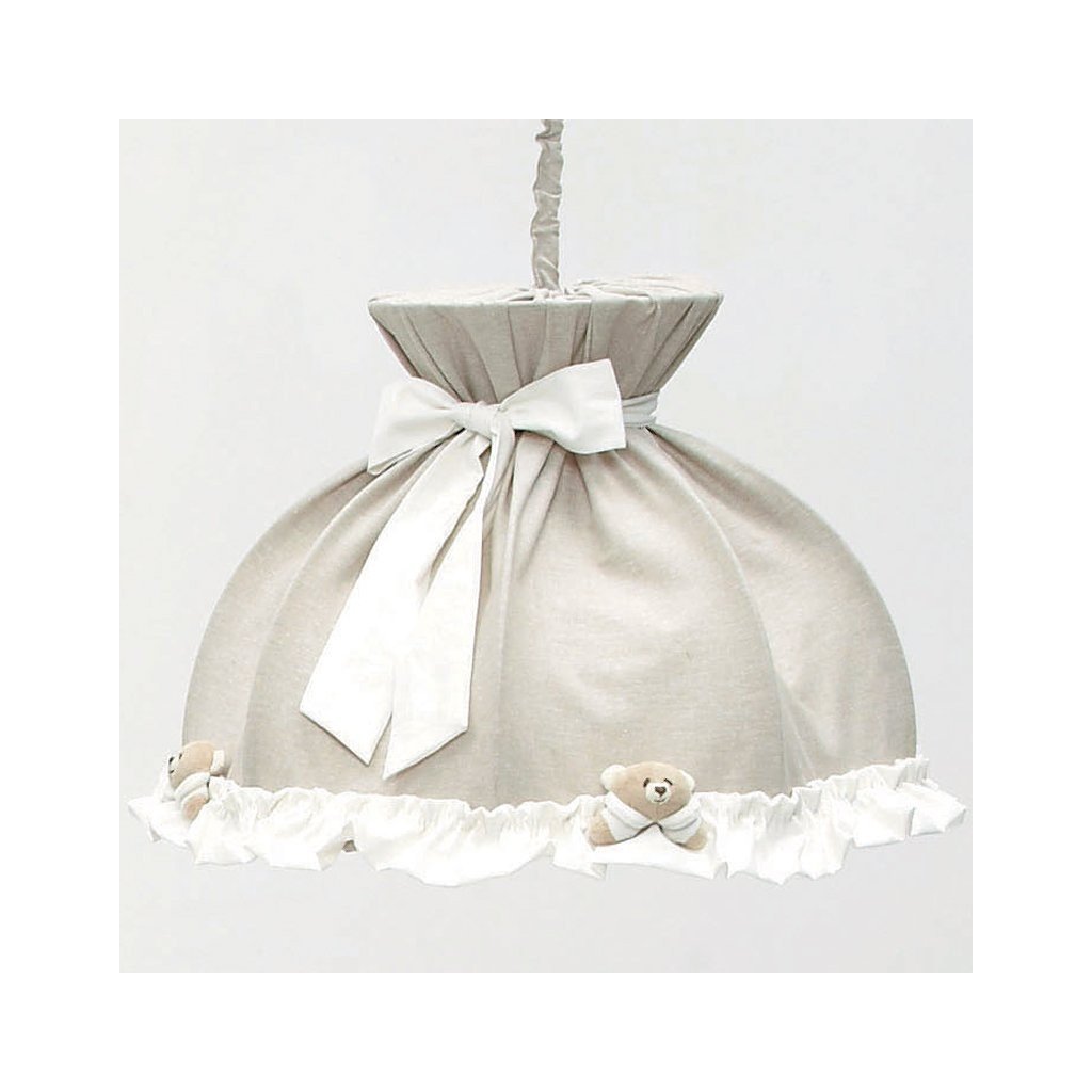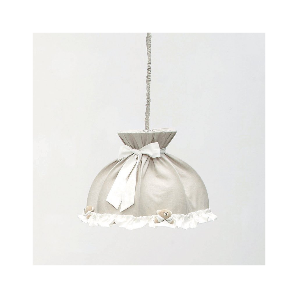 Detský luster do detskej izby s rozkošným medvedíkom Tato, ktorý vytvára jemné svetlo, aby sa vaše dieťa cítilo chránené a v bezpečí v spoločnosti svojich priateľov. Luster Tato má kovovú konštrukciu a tkanina je smotanovej farby, z ktorej visí rozkošný medvedík Tato, čo vytvára romantický súlad s ostatnými doplnkami v detskej izbe.