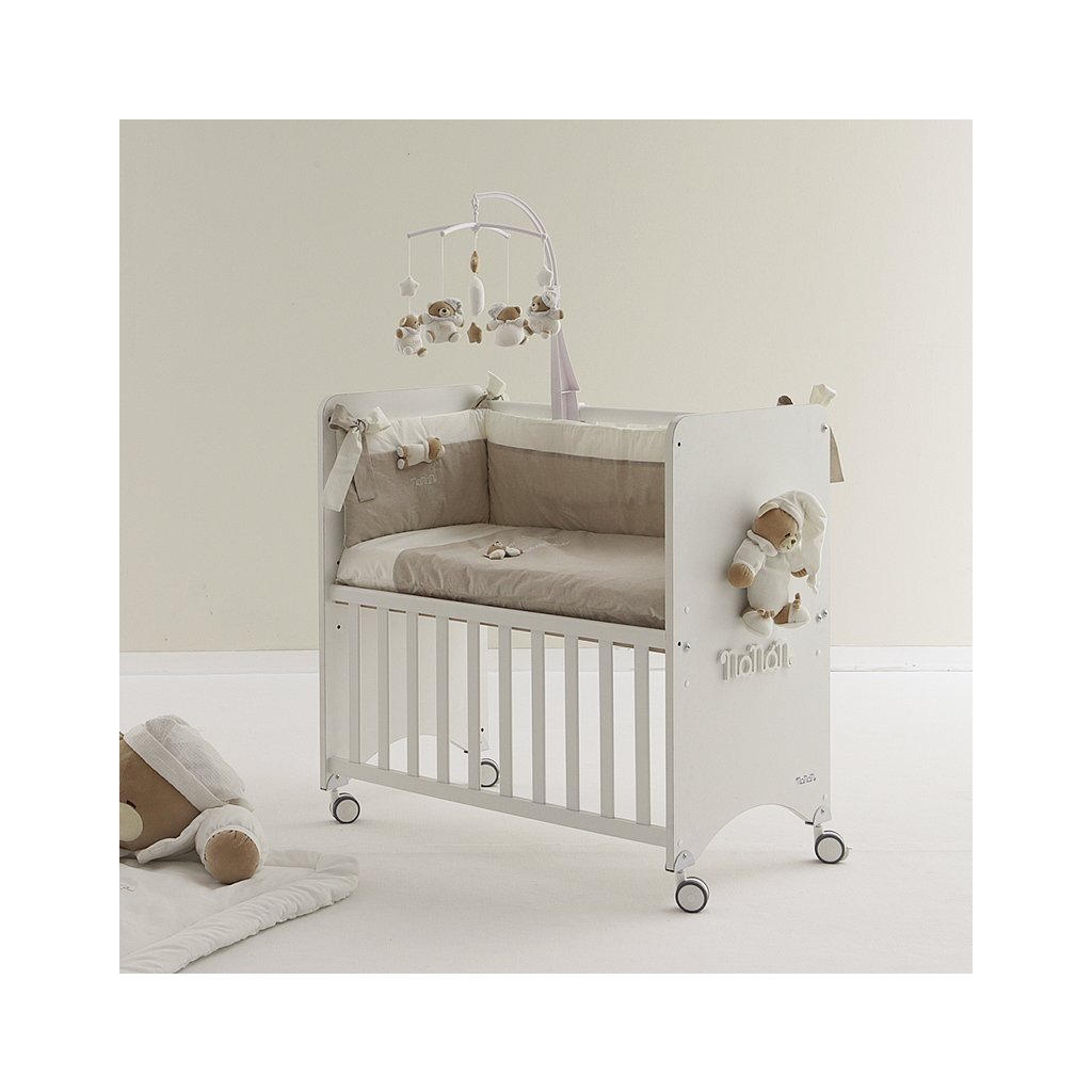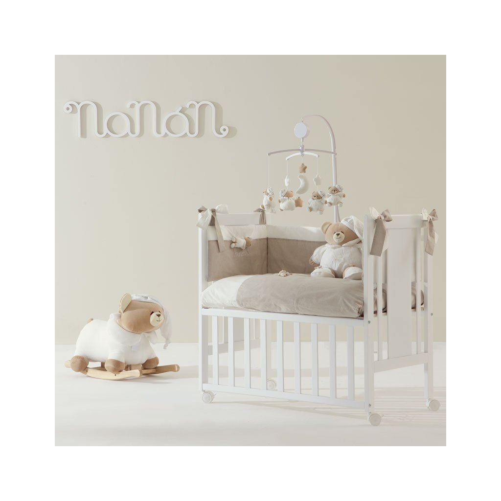 Roztomilý set prádla s mantinelom do detskej postieľky zdobený výšivkami sladkého medvedíka Tato v béžovej farbe. Tento set je vhodný pre Nanán mini postieľku s matracom Tato.