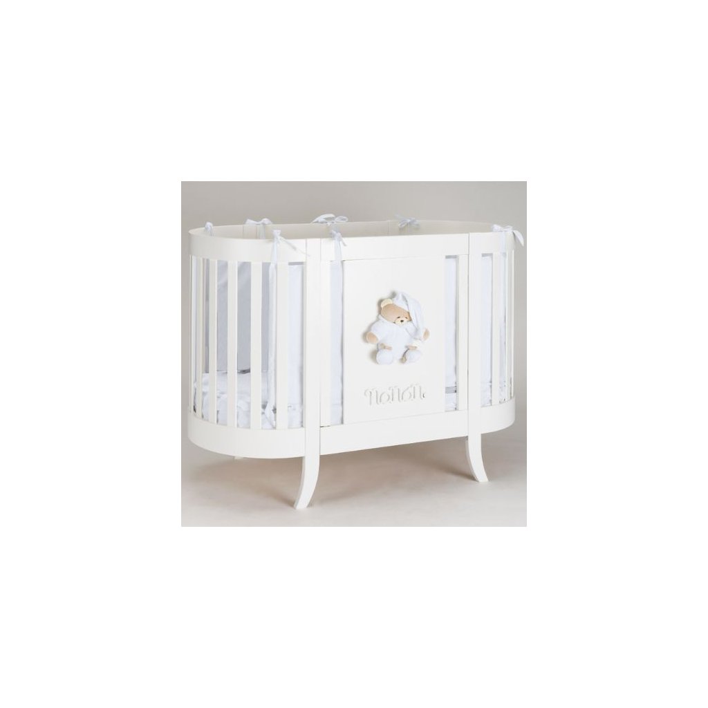 Elegantná detská oválna postieľka s matracom s dekoráciou medvedíka prináša to správne čaro do detskej izbičky. Postieľka je navrhnutá a vyrobená v Taliansku, čo zaručuje vysokú kvalitu a prepracovanosť. Táto kvalitná talianska postieľka je masívna a pevná, pričom pôsobí veľmi elegantne a doplnením ostatných doplnkov kolekcie Puccio modrá vytvoríte dieťatku rozprávkovú detskú izbičku.