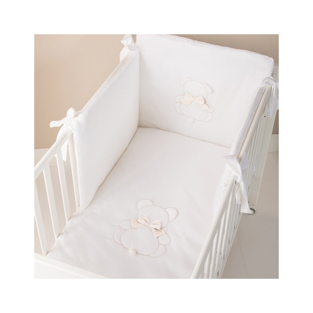 Roztomilý 4-dielny set prádla s mašličkami do detskej postieľky z kolekcie Fiocco v bielej farbe. Set obsahuje: ochranný mantinel, návliečku na vankúšik, návliečku na perinu a samotnú perinu.