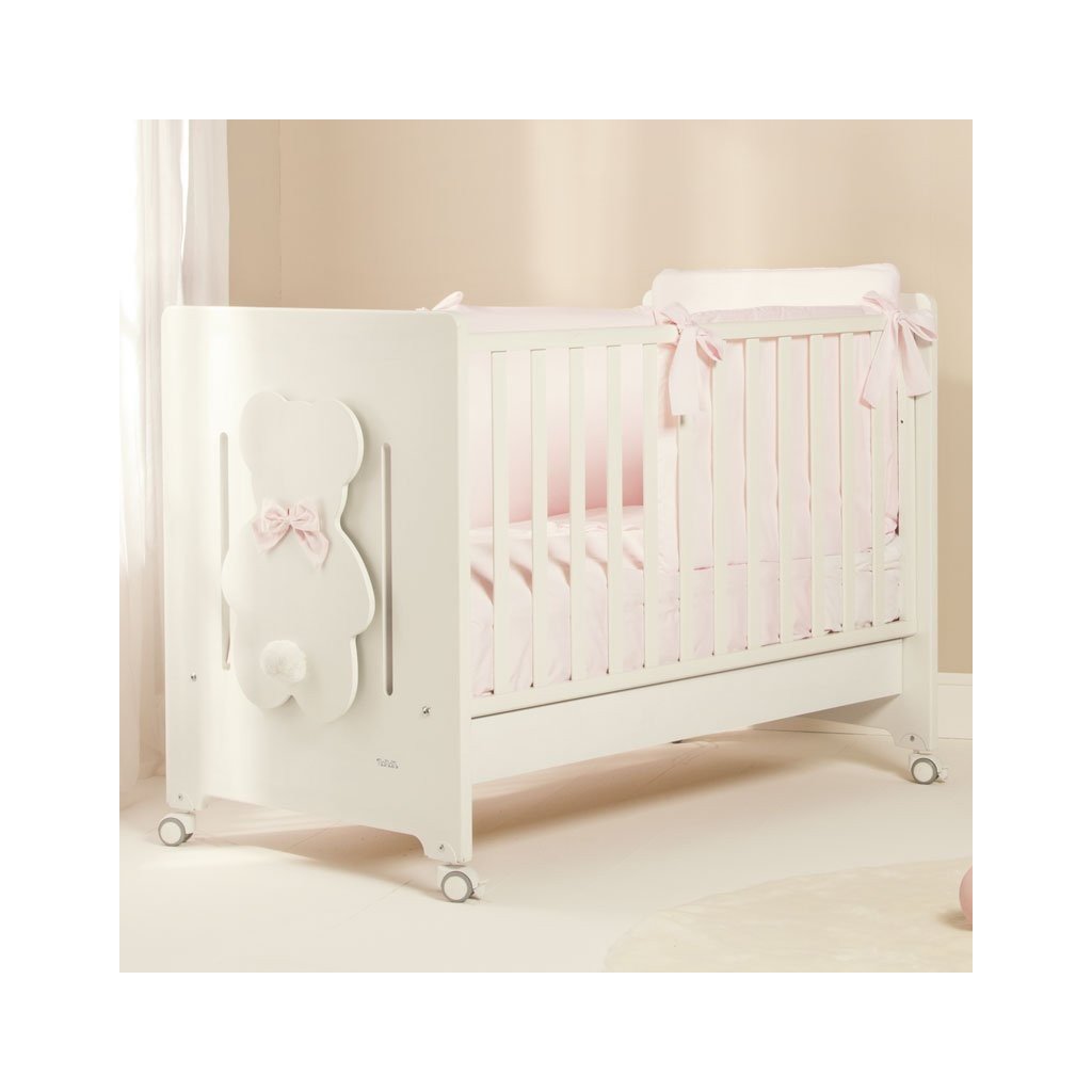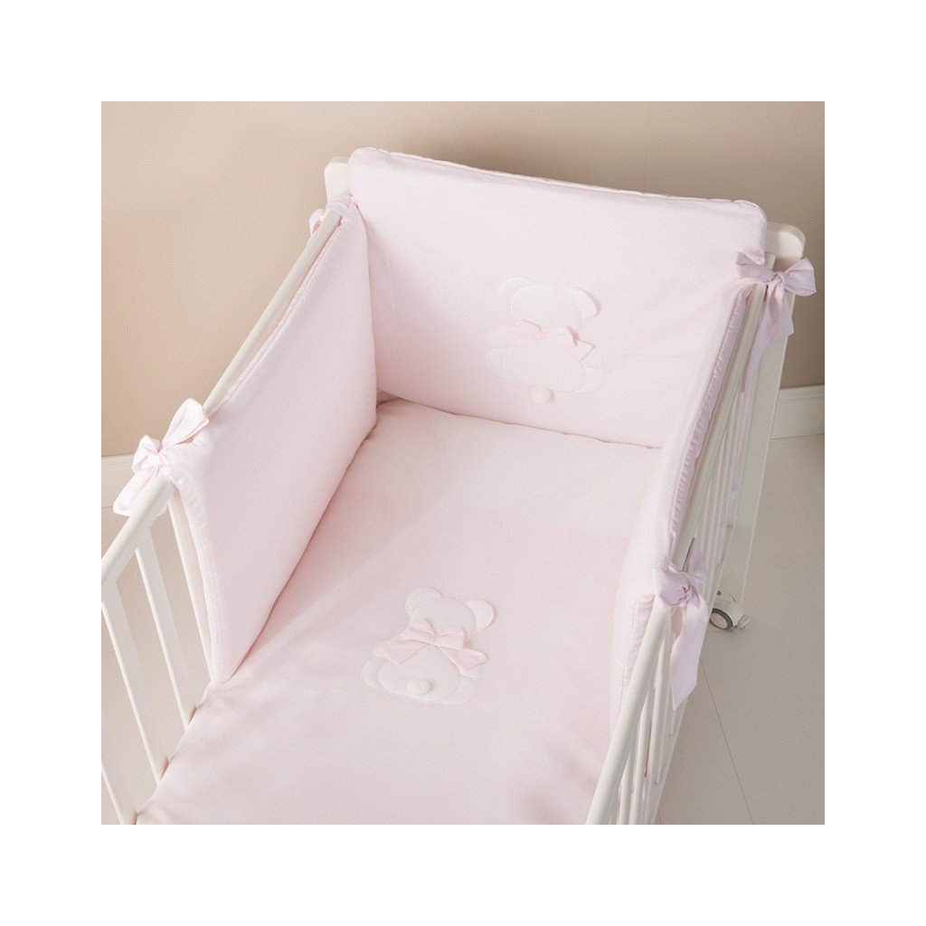 Roztomilý 4-dielny set prádla s mašličkami do detskej postieľky z kolekcie Fiocco v bledoružovej farbe. Set obsahuje: ochranný mantinel, návliečku na vankúšik, návliečku na perinu a samotnú perinu.