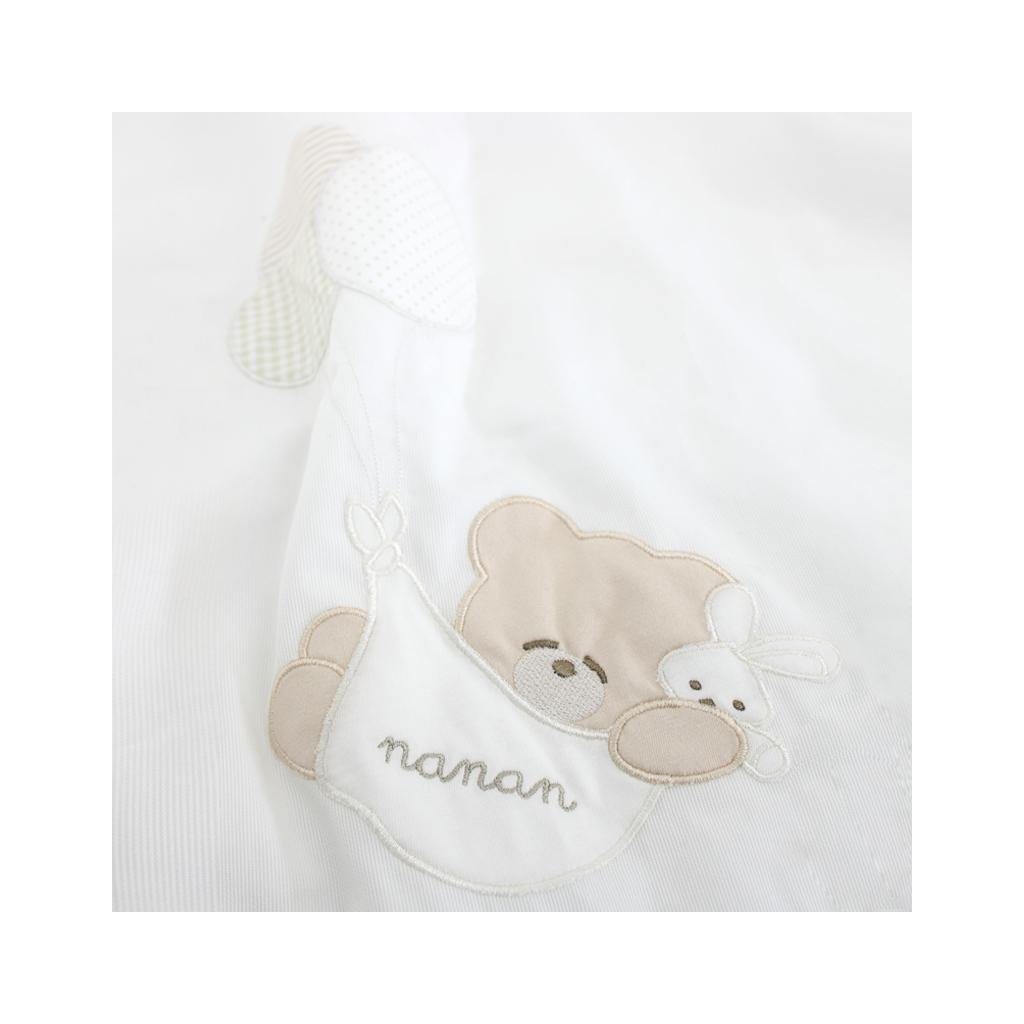 Roztomilý set prádla s mantinelom do detskej postieľky zdobený výšivkami sladkého medvedíka v bielej farbe. Tento kompletný set obsahuje všetko čo potrebujete pre detskú postieľku - ochranný mantinel s mašličkami, obliečku na vankúšik, obliečku na perinu a samotnú perinu. (Neobsahuje vankúšik).