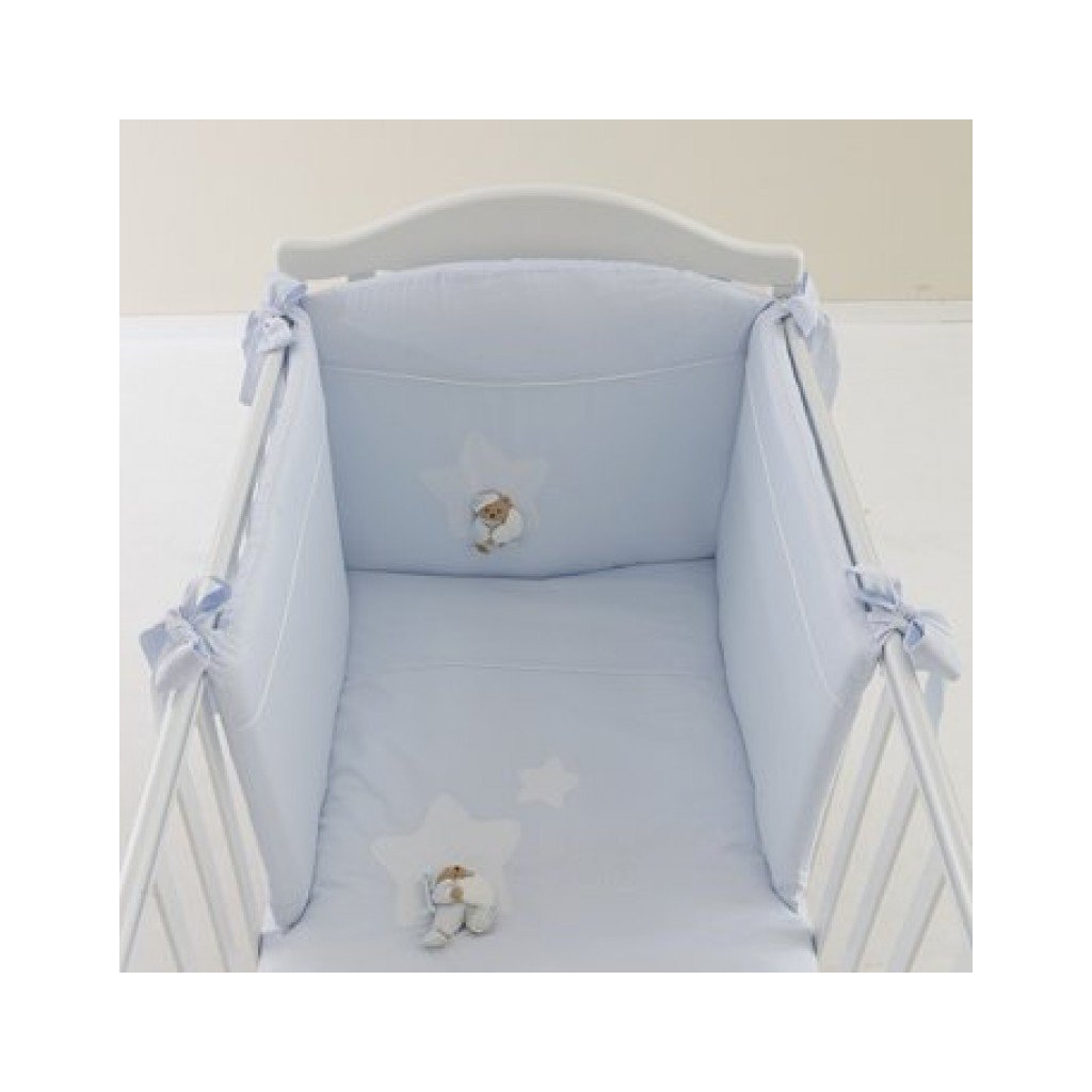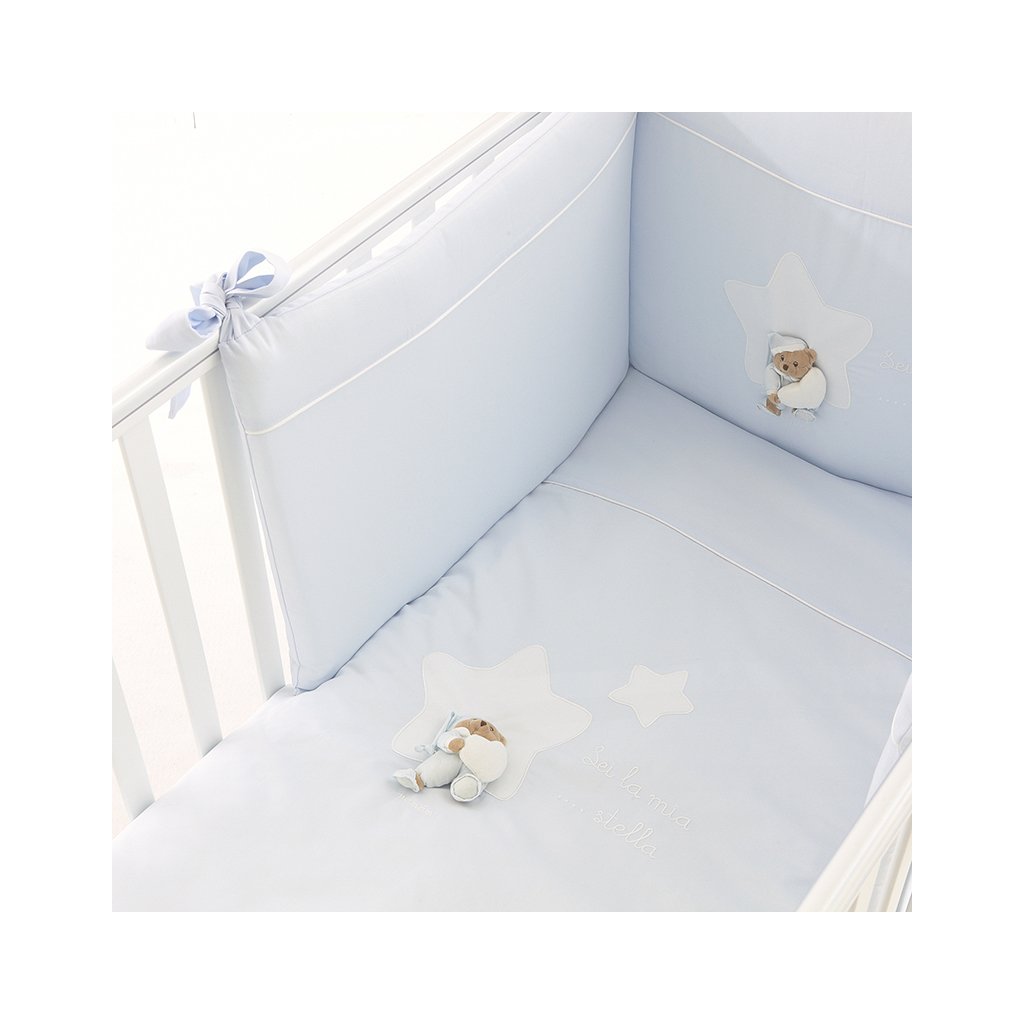 Roztomilý set prádla s mantinelom do detskej postieľky zdobený výšivkami sladkého medvedíka Puccio v bledomodrej farbe. Tento kompletný set obsahuje všetko čo potrebujete pre detskú postieľku - ochranný mantinel s mašličkami, obliečku na vankúšik, obliečku na perinu a samotnú perinu. (Neobsahuje vankúšik).