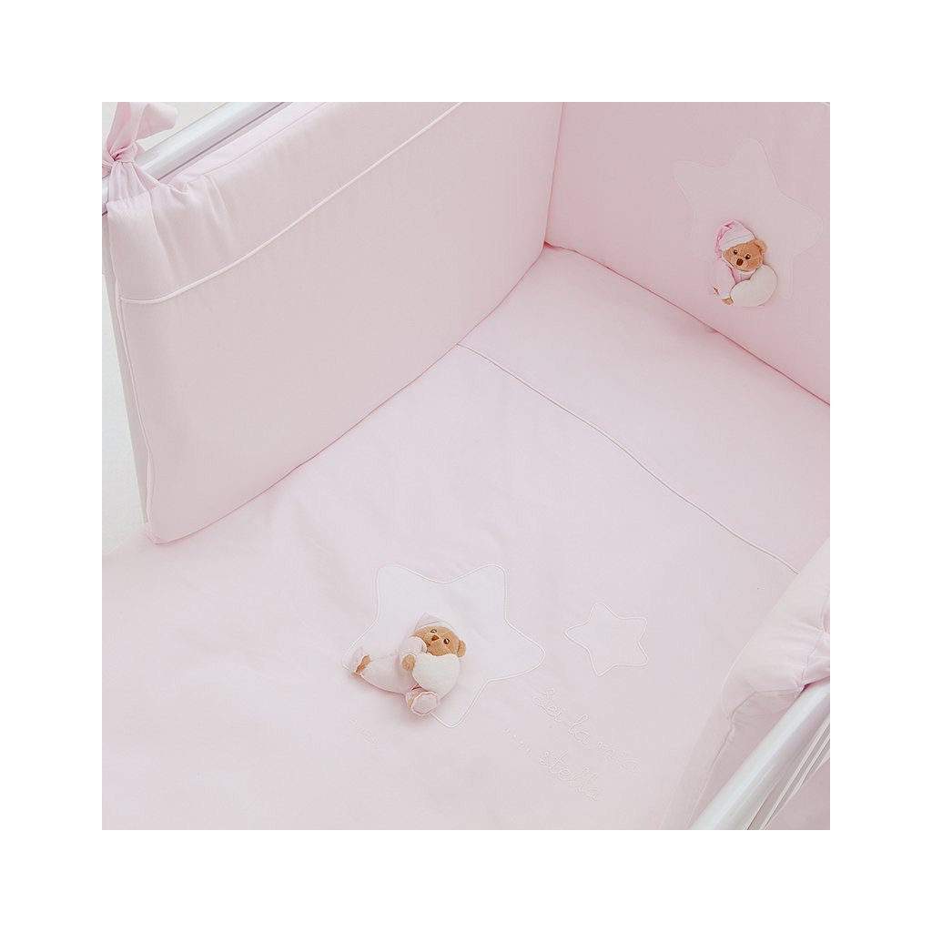 Roztomilý 4-dielny set prádla s mašličkami do detskej postieľky s medvedíkom Puccio v ružovej farbe. Set obsahuje: ochranný mantinel, návliečku na vankúšik, návliečku na perinu a samotnú perinu.