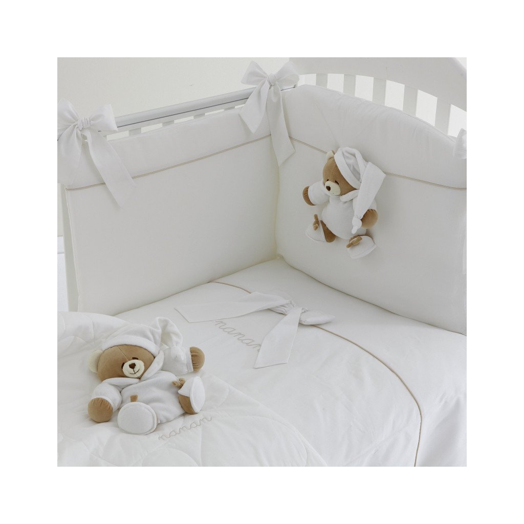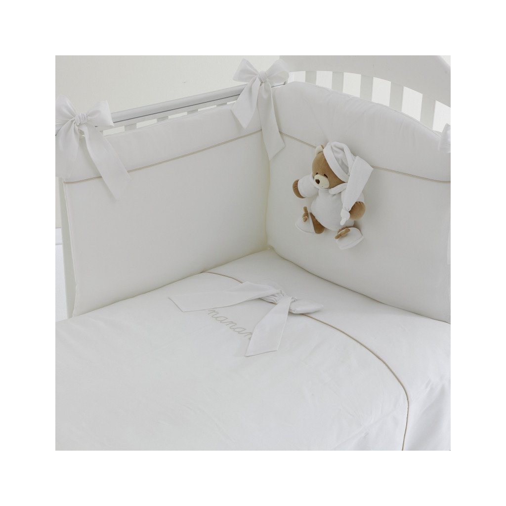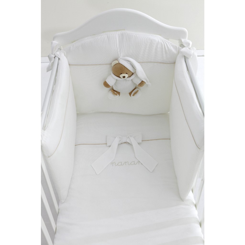 Roztomilý set prádla s mantinelom do detskej postieľky zdobený výšivkami sladkého medvedíka Tato v béžovej farbe. Tento kompletný set obsahuje všetko čo potrebujete pre detskú postieľku - ochranný mantinel s mašličkami, obliečku na vankúšik, obliečku na perinu a samotnú perinu. (Neobsahuje vankúšik).