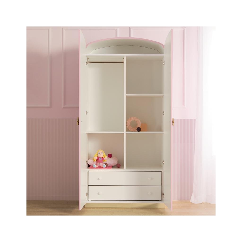 Romantická skriňa do detskej izbičky z kolekcie Chiara Ferragni v ružovej farbe. Okrem vnútorných políc sa vo vnútri nachádzajú dva pohodlné šuplíky, do ktorých uložíte všetko potrebné pre Vaše bábätko.