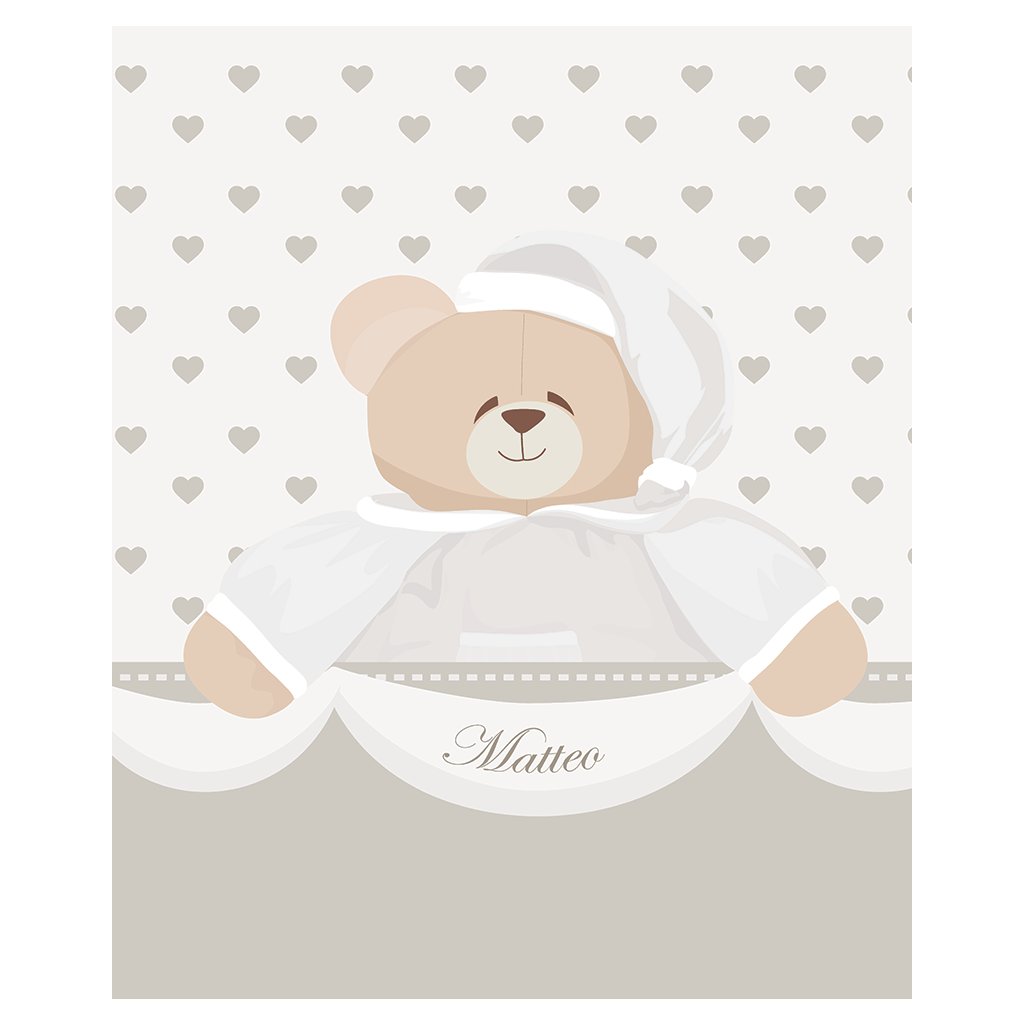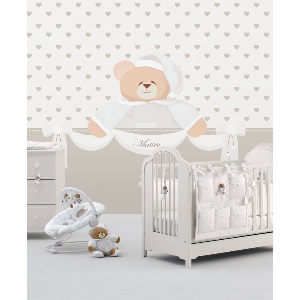 Personalizovaná tapeta na mieru s medvedíkom Tato, ktorý drží stužku s menom dieťatka, s ktorým bude zdieľať izbu. Dostupná vo farbách: béžová, modrá a ružová.