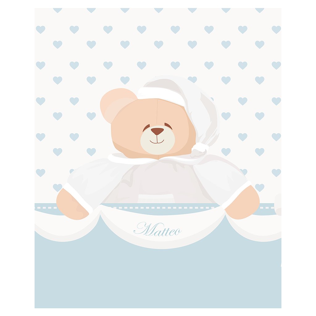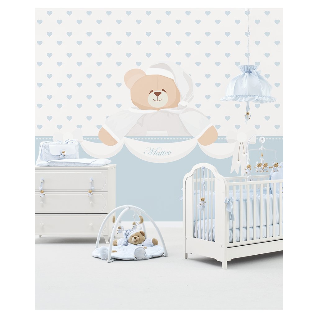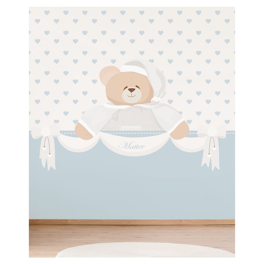 Personalizovaná tapeta na mieru s medvedíkom Tato, ktorý drží stužku s menom dieťatka, s ktorým bude zdieľať izbu. Dostupná vo farbách: béžová, modrá a ružová.