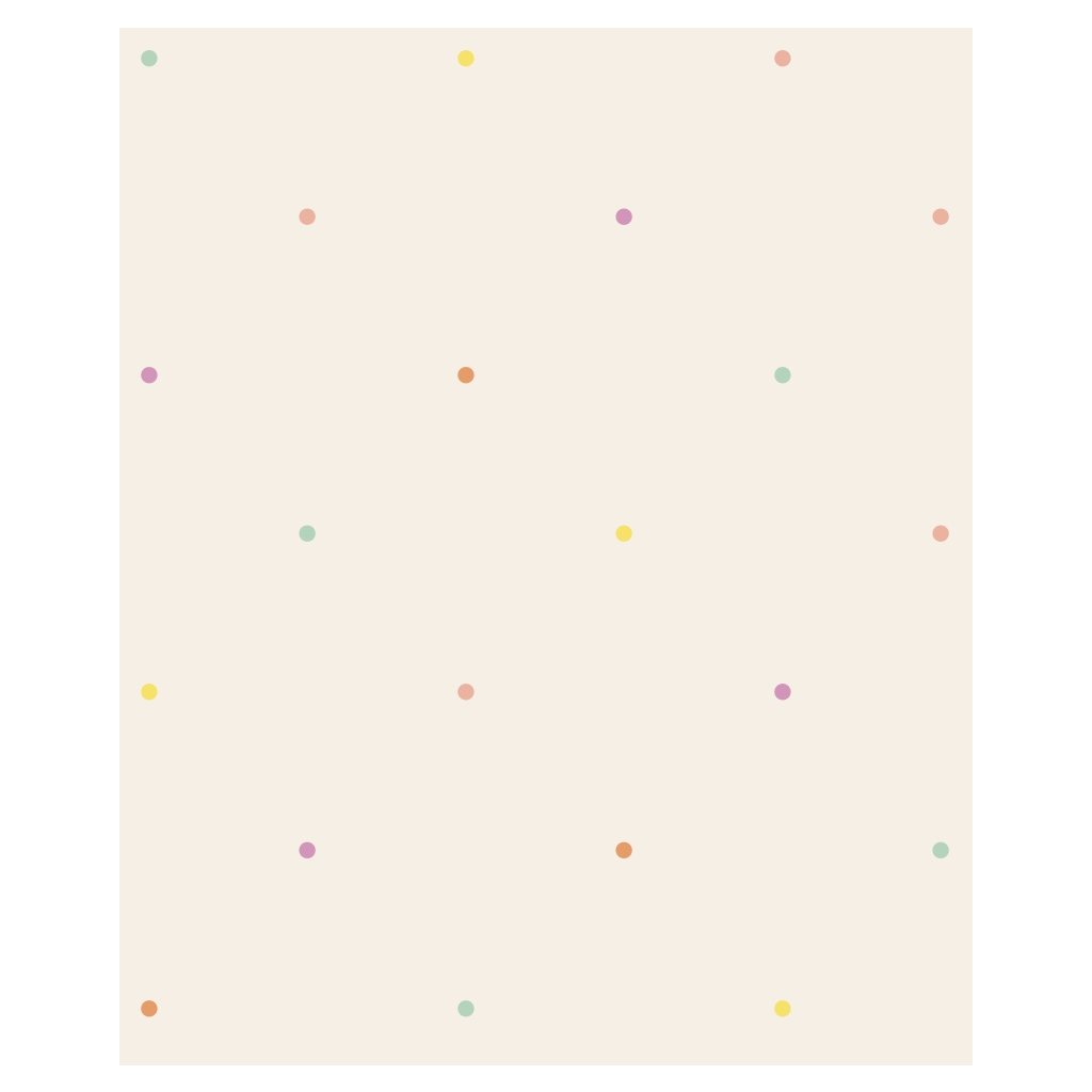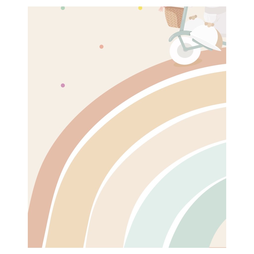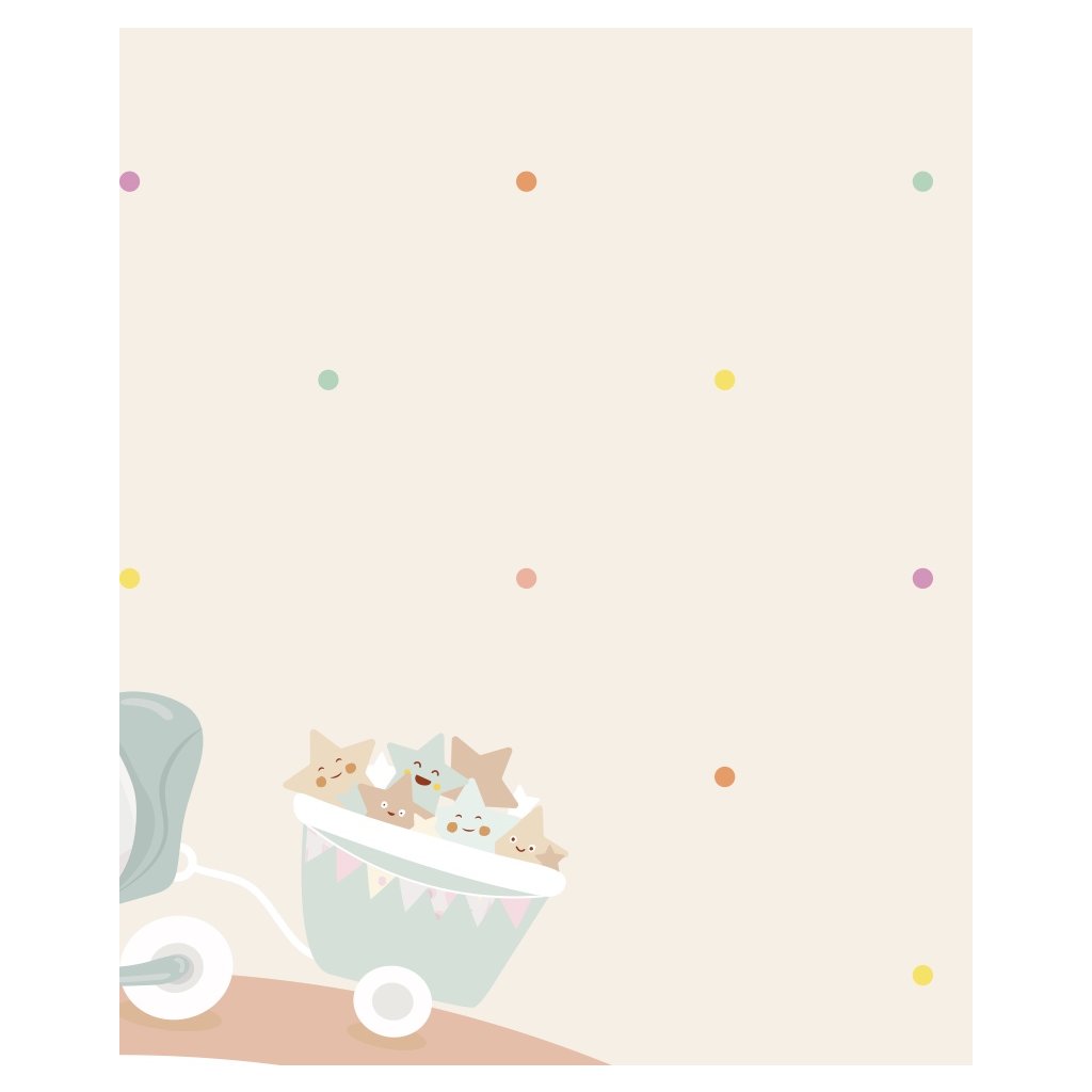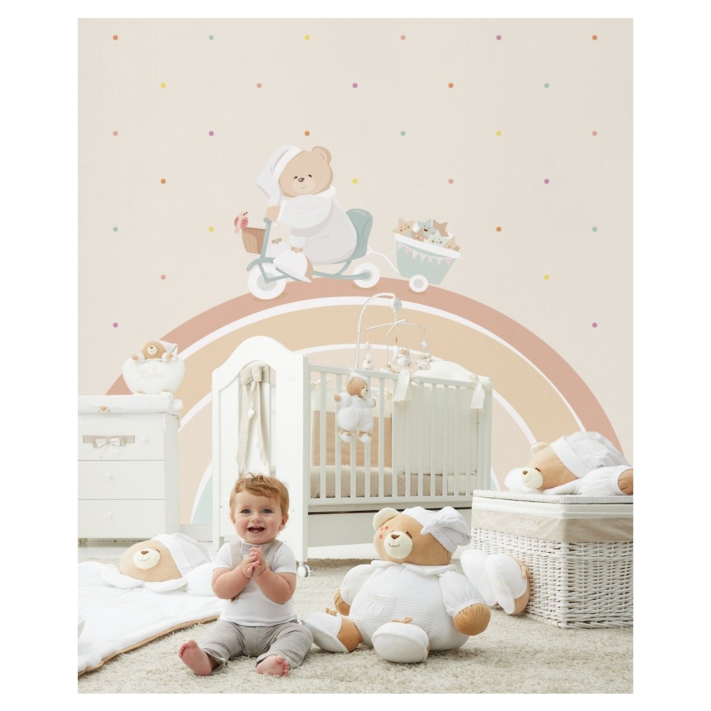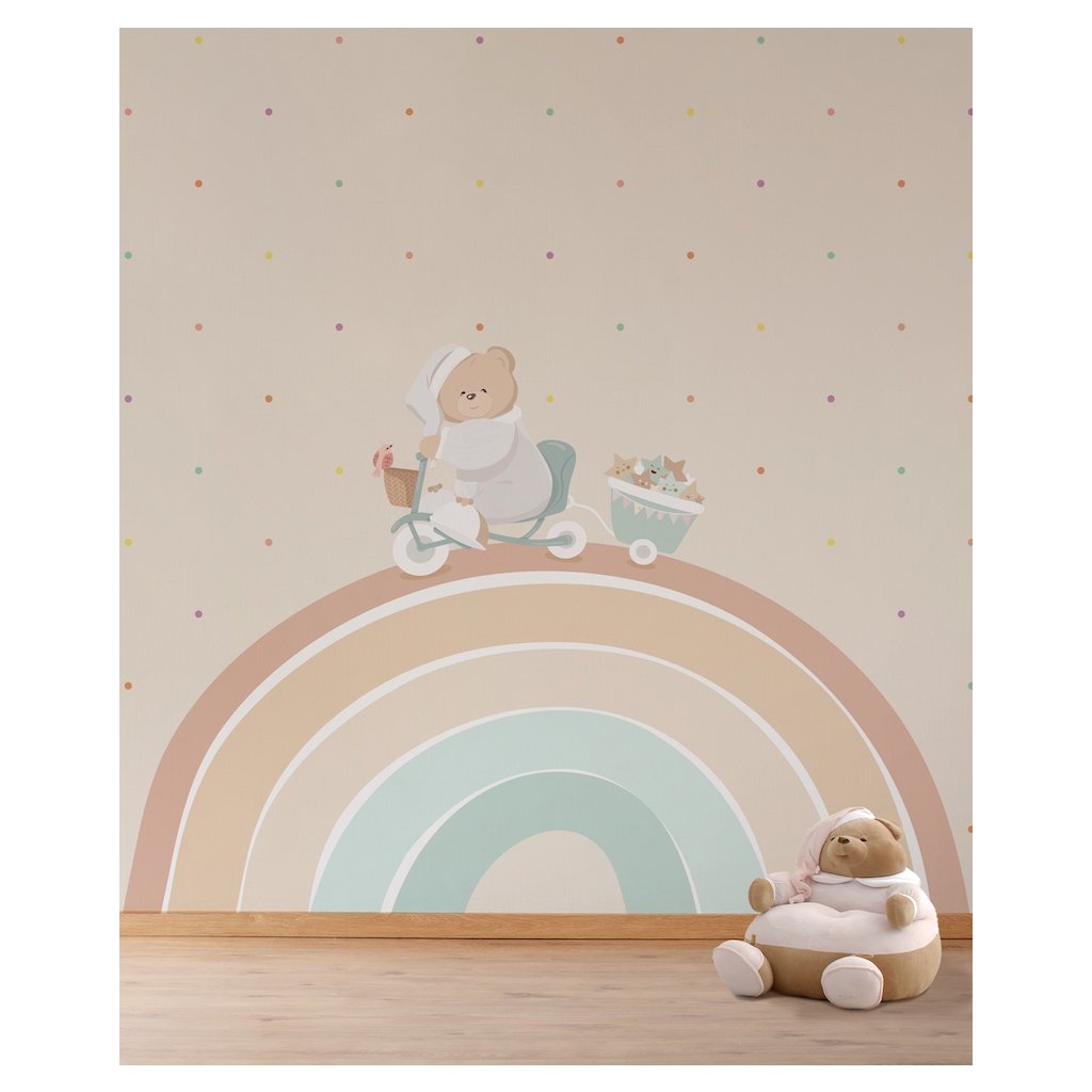 Tapeta Tato na dúhe je hravá a veselá tapeta, kde medvedík Tato prechádza na trojkolke s vozíčkom, kde má kopec farebných hviezdičiek. Tapeta je bodkovaná s rôznymi farebnými guličkami. Jemné a teplé farby sú ideálne pre spoločenské izby chlapcov a dievčat.