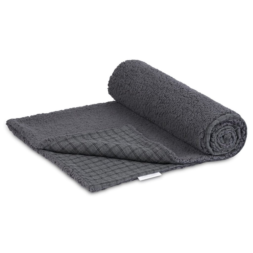 Obojstranná deka mušelín a umelá kožušina grafitová s kockou