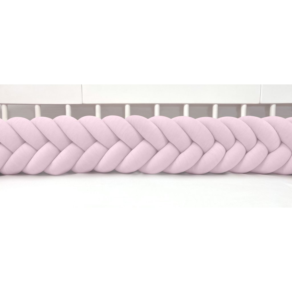 Plyšový ochranný zapletaný mantinel - pletenec päťkový slúži ako ochranca vášho dieťatka v postieľke a zároveň ako štýlový doplnok v detskej izbe. Pletenec má sadu ozdobných stúh na pripevnenie. Výška cca 22 cm, hrúbka cca 10 cm. Mantinel je dostupný v rôznych dĺžkach (od 120 cm do 400 cm). Všetky pramene sú vyrobené z kvalitného Prémium bavlneného velúru (certifikát Oeko Tex Standard 100) a ručne spletené do vrkoča. Záruka najvyššej kvality – 100% Handmade. Farba: bledoružová, číslo vo vzorkovníku: 08.