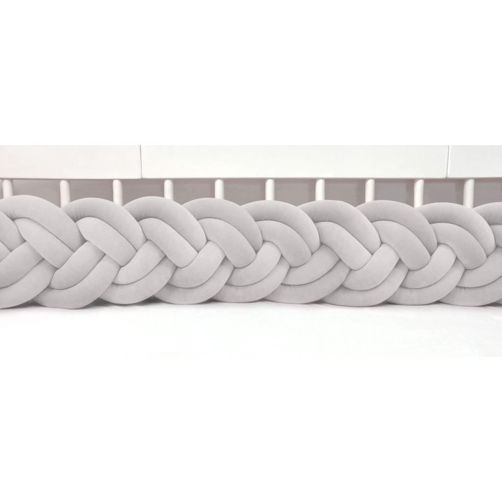 Plyšový ochranný zapletaný mantinel - pletenec šesťkový slúži ako ochranca vášho dieťatka v postieľke a zároveň ako štýlový doplnok v detskej izbe. Pletenec má sadu ozdobných stúh na pripevnenie. Výška cca 30 cm, hrúbka cca 10 cm. Mantinel je dostupný v rôznych dĺžkach (od 120 cm do 400 cm). Všetky pramene sú vyrobené z kvalitného Prémium bavlneného velúru (certifikát Oeko Tex Standard 100) a ručne spletené do vrkoča. Záruka najvyššej kvality – 100% Handmade. Farba: bledošedý, číslo vo vzorkovníku: 17.