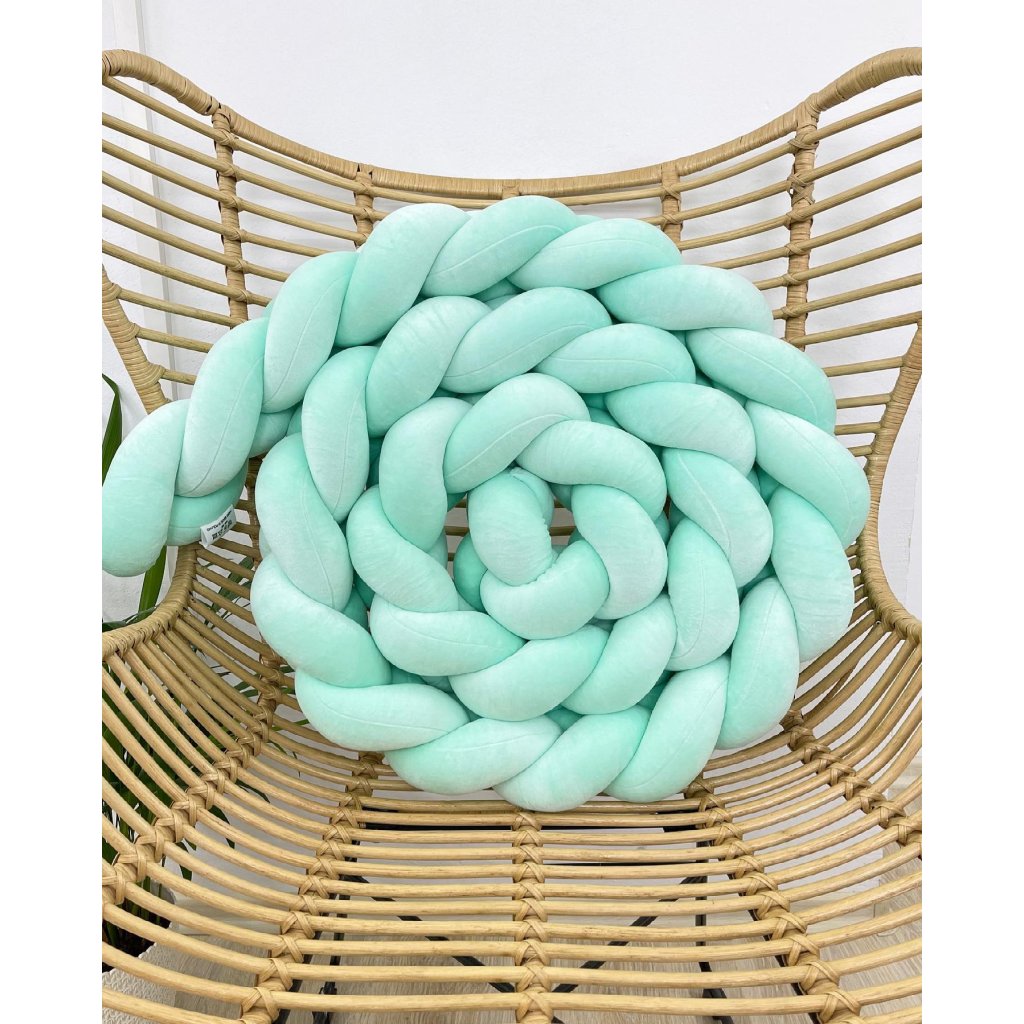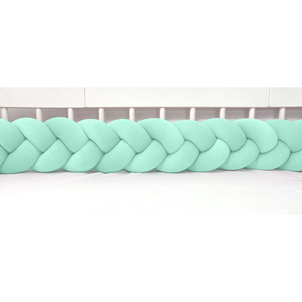 Plyšový ochranný zapletaný mantinel - pletenec trojitý slúži ako ochranca vášho dieťatka v postieľke a zároveň ako štýlový doplnok v detskej izbe. Pletenec má sadu ozdobných stúh na pripevnenie. Výška cca 15 cm, hrúbka cca 6 cm. Mantinel je dostupný v rôznych dĺžkach (od 120 cm do 400 cm). Všetky 3 pramene sú vyrobené z kvalitného Prémium bavlneného velúru (certifikát Oeko Tex Standard 100) a ručne spletené do vrkoča. Záruka najvyššej kvality – 100% Handmade. Farba: bledá mäta, číslo vo vzorkovníku: 12.