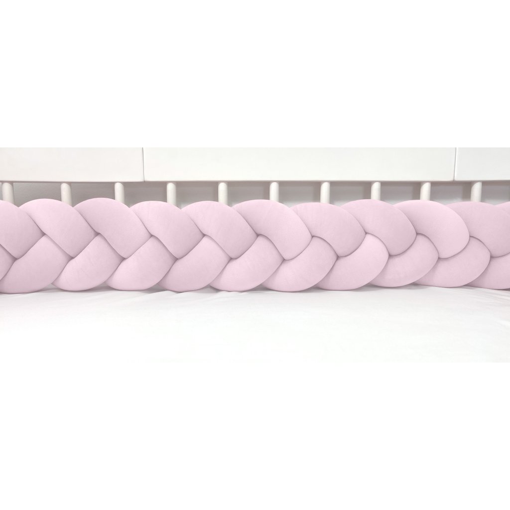 Plyšový ochranný zapletaný mantinel - pletenec trojitý slúži ako ochranca vášho dieťatka v postieľke a zároveň ako štýlový doplnok v detskej izbe. Pletenec má sadu ozdobných stúh na pripevnenie. Výška cca 15 cm, hrúbka cca 6 cm. Mantinel je dostupný v rôznych dĺžkach (od 120 cm do 400 cm). Všetky 3 pramene sú vyrobené z kvalitného Prémium bavlneného velúru (certifikát Oeko Tex Standard 100) a ručne spletené do vrkoča. Záruka najvyššej kvality – 100% Handmade. Farba: bledoružová, číslo vo vzorkovníku: 08.