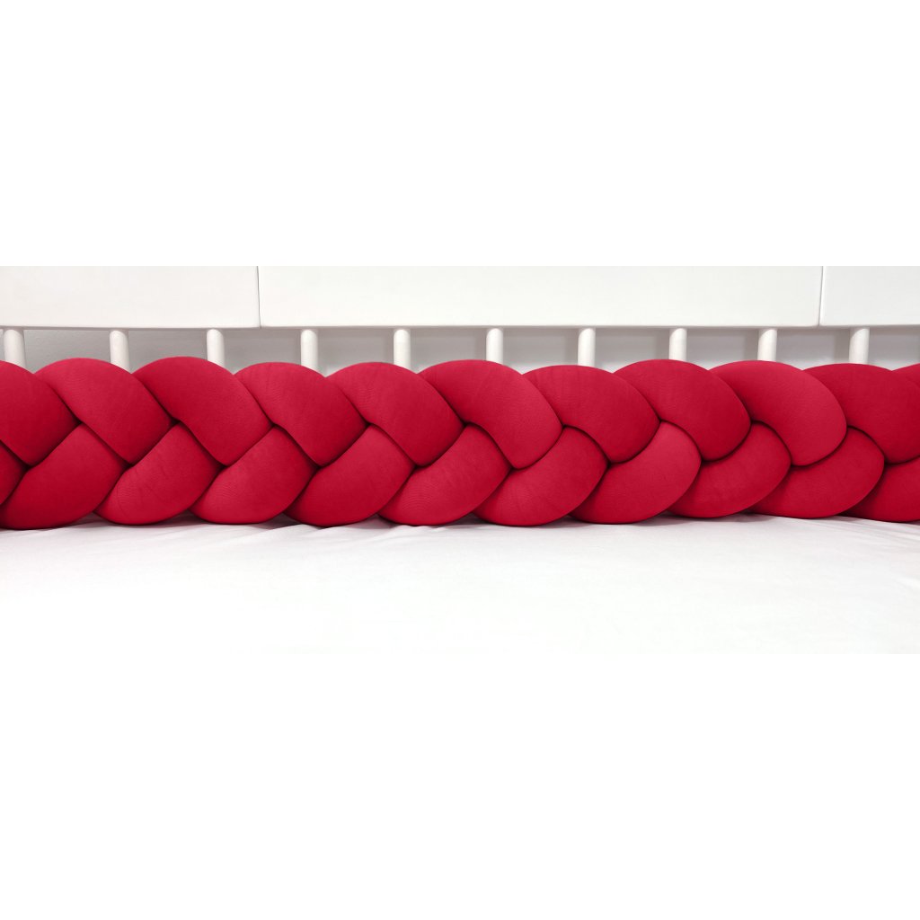 Plyšový ochranný zapletaný mantinel - pletenec trojitý slúži ako ochranca vášho dieťatka v postieľke a zároveň ako štýlový doplnok v detskej izbe. Pletenec má sadu ozdobných stúh na pripevnenie. Výška cca 15 cm, hrúbka cca 6 cm. Mantinel je dostupný v rôznych dĺžkach (od 120 cm do 400 cm). Všetky 3 pramene sú vyrobené z kvalitného Prémium bavlneného velúru (certifikát Oeko Tex Standard 100) a ručne spletené do vrkoča. Záruka najvyššej kvality – 100% Handmade. Farba: červená, číslo vo vzorkovníku: 11.