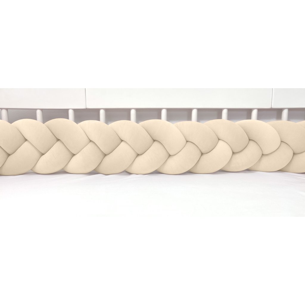 Plyšový ochranný zapletaný mantinel - pletenec trojitý slúži ako ochranca vášho dieťatka v postieľke a zároveň ako štýlový doplnok v detskej izbe. Pletenec má sadu ozdobných stúh na pripevnenie. Výška cca 15 cm, hrúbka cca 6 cm. Mantinel je dostupný v rôznych dĺžkach (od 120 cm do 400 cm). Všetky 3 pramene sú vyrobené z kvalitného Prémium bavlneného velúru (certifikát Oeko Tex Standard 100) a ručne spletené do vrkoča. Záruka najvyššej kvality – 100% Handmade. Farba: smotanová, číslo vo vzorkovníku: 02.