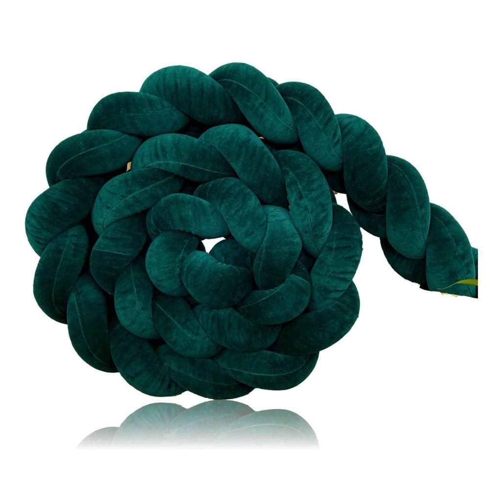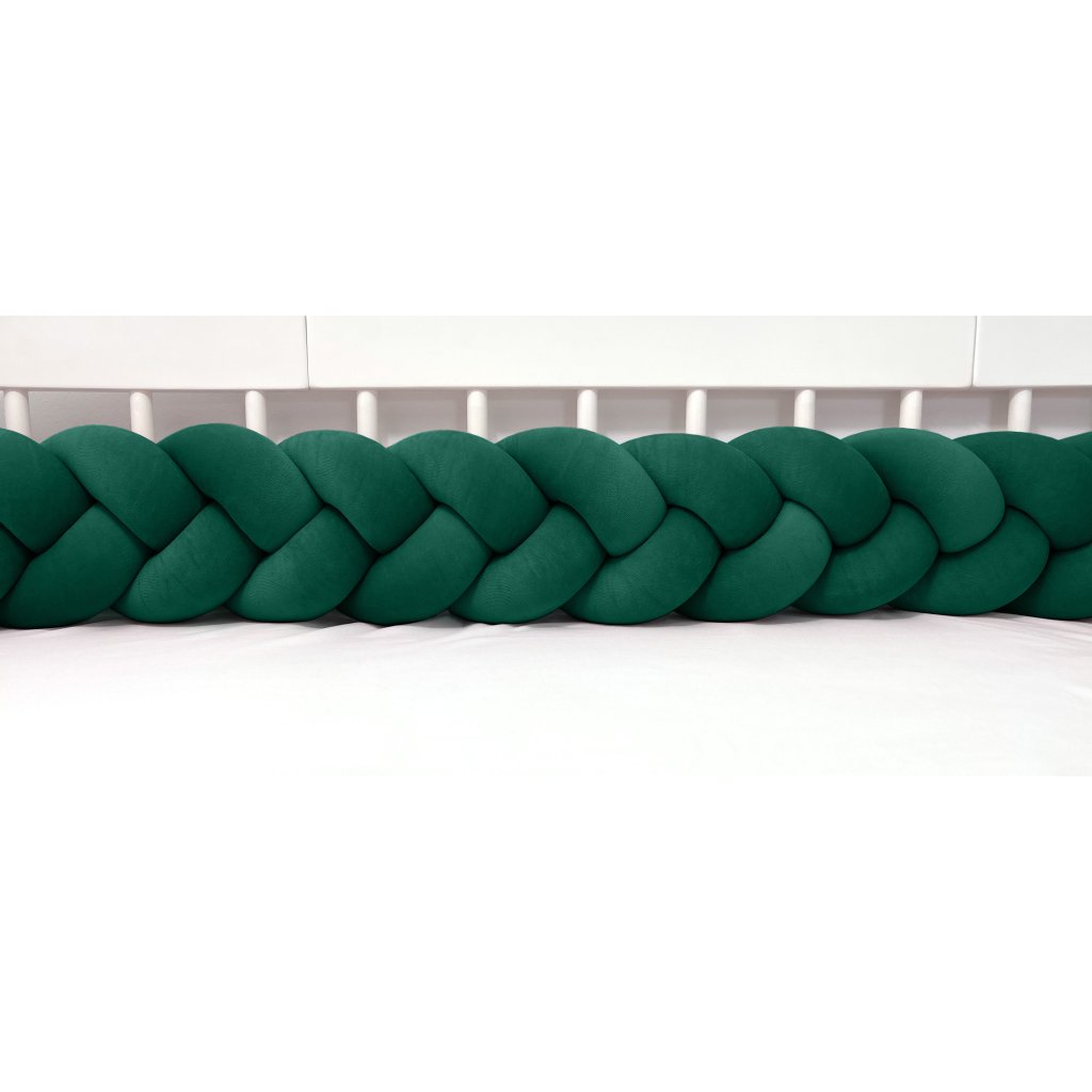 Plyšový ochranný zapletaný mantinel - pletenec trojitý slúži ako ochranca vášho dieťatka v postieľke a zároveň ako štýlový doplnok v detskej izbe. Pletenec má sadu ozdobných stúh na pripevnenie. Výška cca 15 cm, hrúbka cca 6 cm. Mantinel je dostupný v rôznych dĺžkach (od 120 cm do 400 cm). Všetky 3 pramene sú vyrobené z kvalitného Prémium bavlneného velúru (certifikát Oeko Tex Standard 100) a ručne spletené do vrkoča. Záruka najvyššej kvality – 100% Handmade. Farba: tmavozelená, číslo vo vzorkovníku: 21.