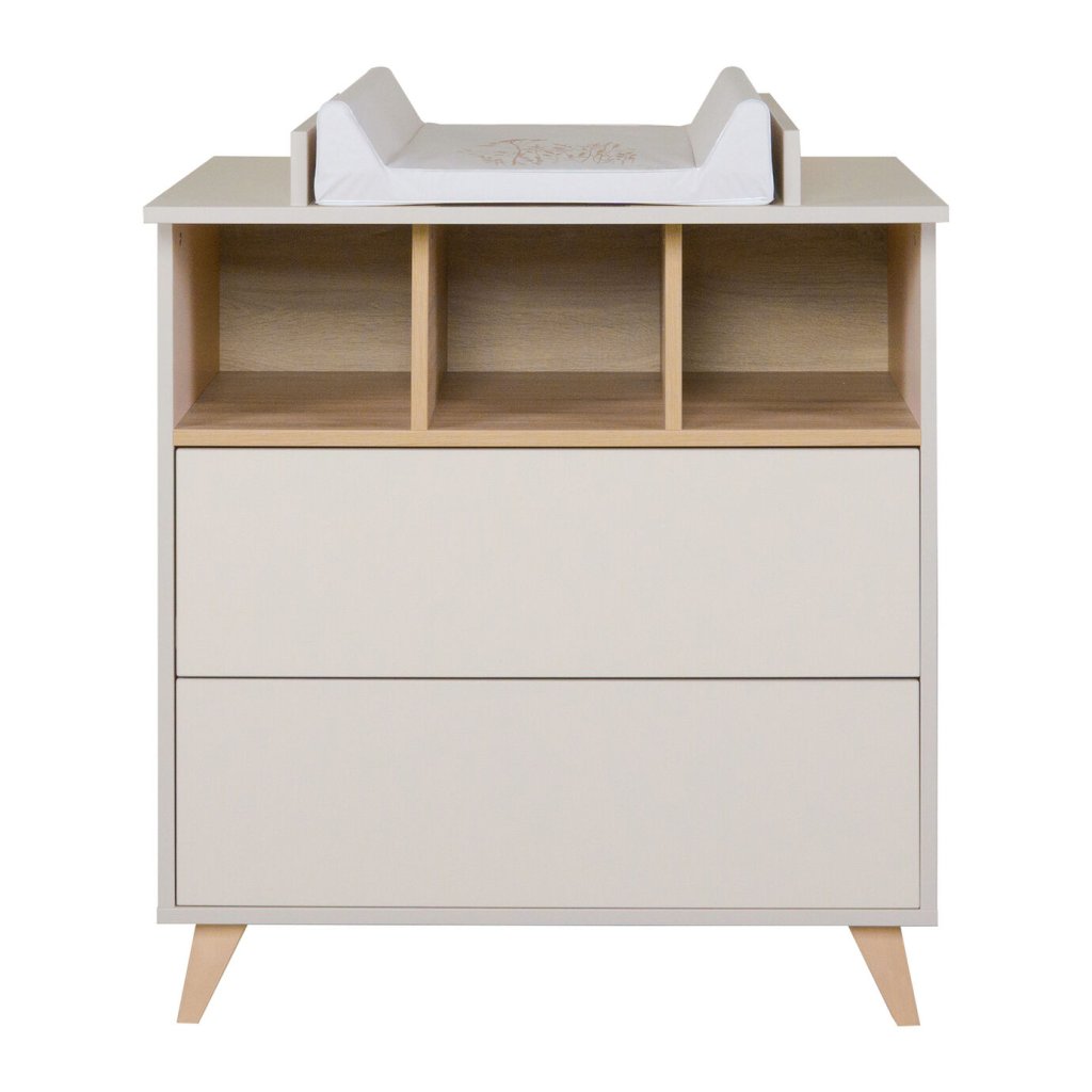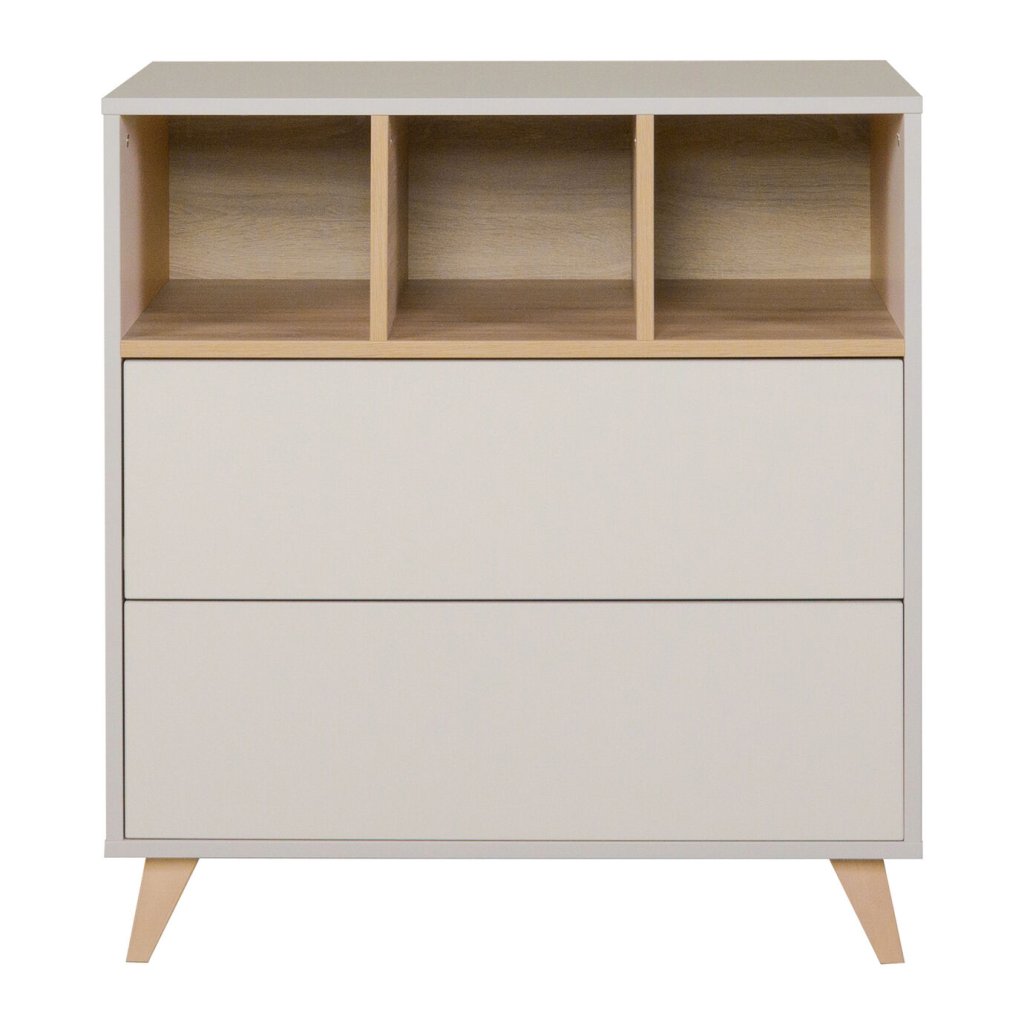 Detská komoda na nožičkách z kolekcie Loft dodá detskej izbe ten správny štýl. Komoda má 2 šuplíky a otvorenú poličku s troma priehradkami na odloženie drobností, aby boli vždy po ruke pri prebaľovaní. Nezaberie veľa miesta a disponuje veľkým úložným priestorom.