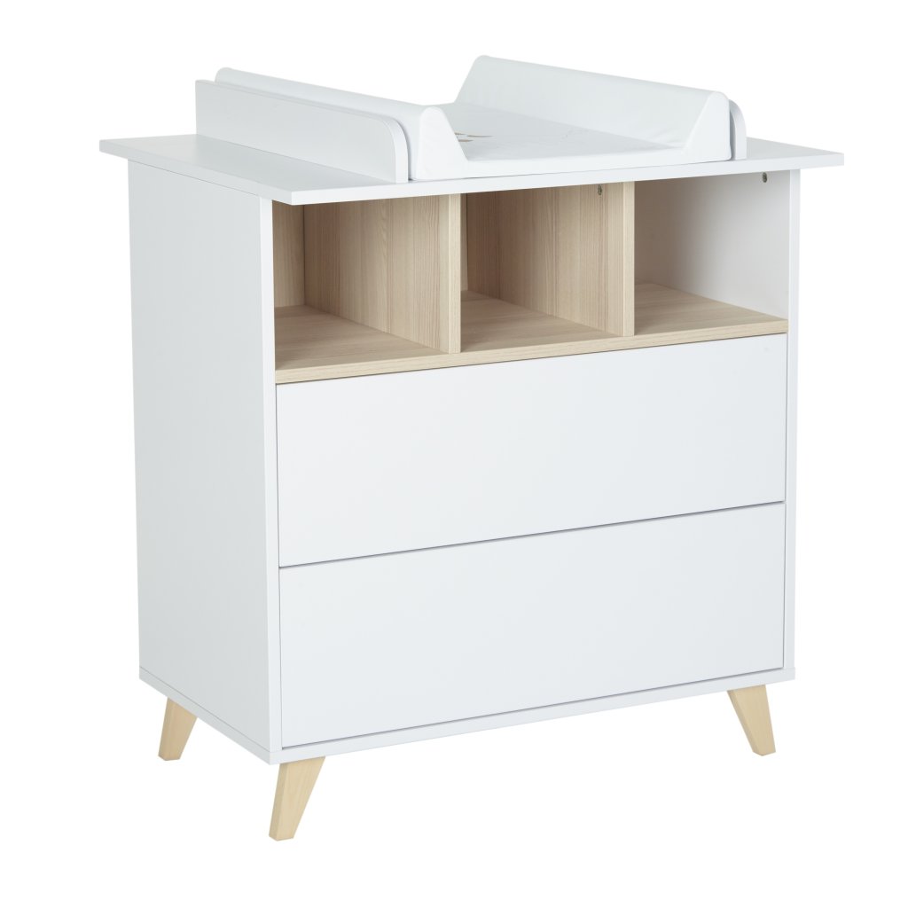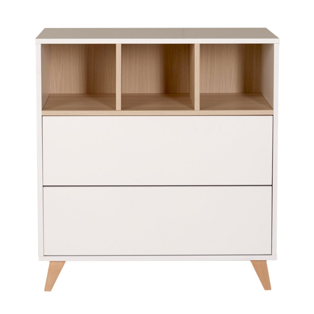 Detská komoda na nožičkách z kolekcie Loft dodá detskej izbe ten správny štýl. Komoda má 2 šuplíky a otvorenú poličku s troma priehradkami na odloženie drobností, aby boli vždy po ruke pri prebaľovaní. Nezaberie veľa miesta a disponuje veľkým úložným priestorom.