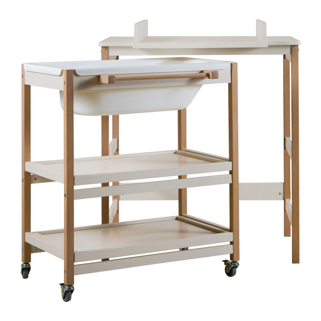 Dizajnový prebaľovací pult s výsuvnou vaničku na kolieskach s dvoma výsuvnými poličkami. Pult má 2 samostatné časti. Farba pultu: béžová + prírodná