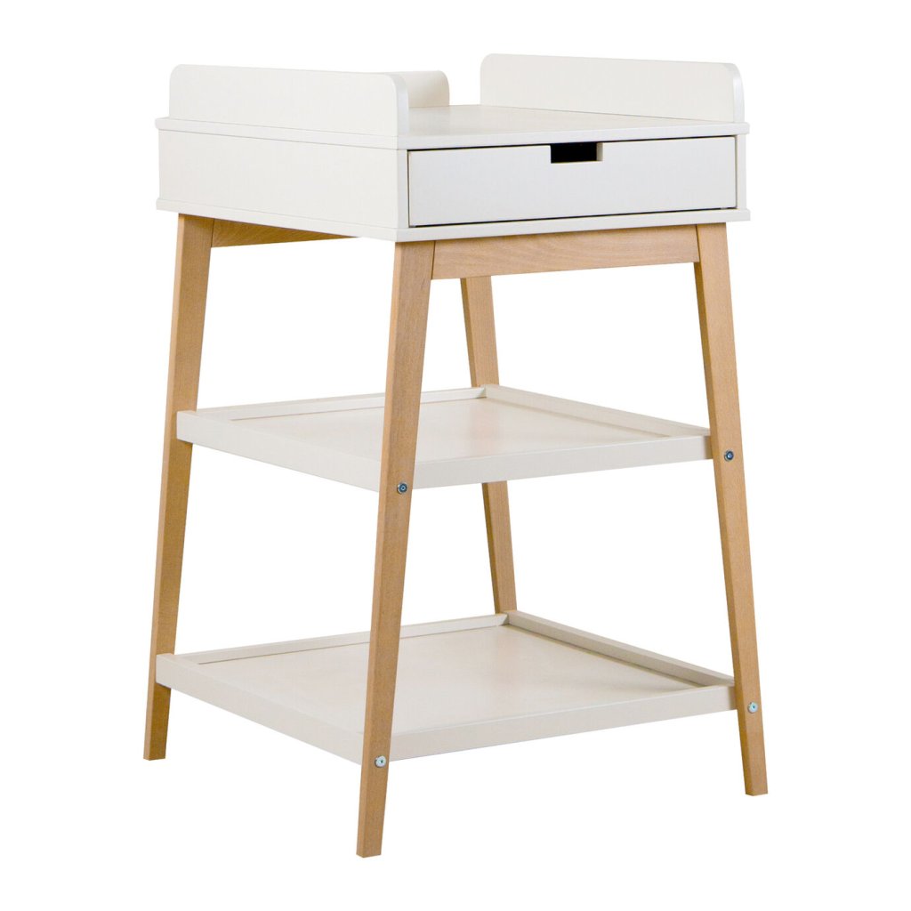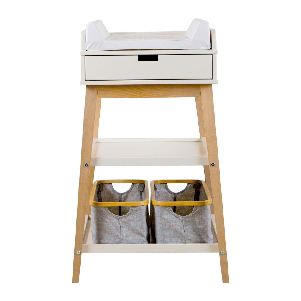 Dizajnový prebaľovací pult s praktickým šuplíkom a dvoma pevnými poličkami do váhy 11 kg dieťaťa. Tento pult je bezpečným a pohodlným miestom pre bábätko, ktoré uľahčuje nielen prebaľovanie, ale aj celkovú starostlivosť o dieťa. Farba: poličky sú v jemnej béžovej farbe a nohy prírodné.