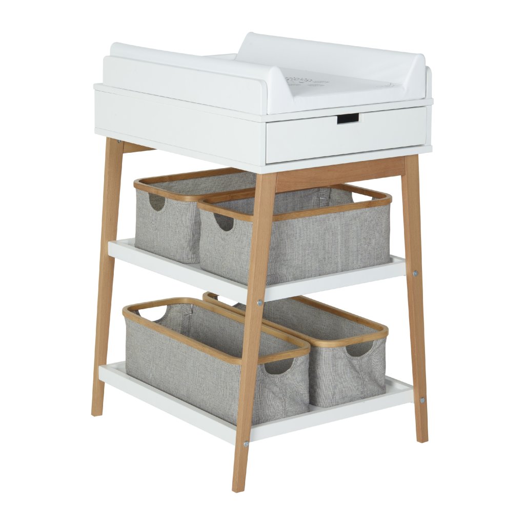Dizajnový prebaľovací pult s praktickým šuplíkom a dvoma pevnými poličkami do váhy 11 kg dieťaťa. Tento pult je bezpečným a pohodlným miestom pre bábätko, ktoré uľahčuje nielen prebaľovanie, ale aj celkovú starostlivosť o dieťa.