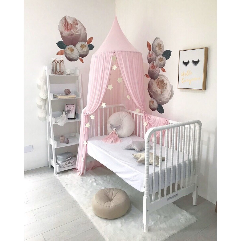 Baldachýn, ktorý má minimalistický dizajn, dodávaný so stuhami vo vnútri a spredu, ktoré môžu zaistiť kolotoče a iné závesné dekorácie.