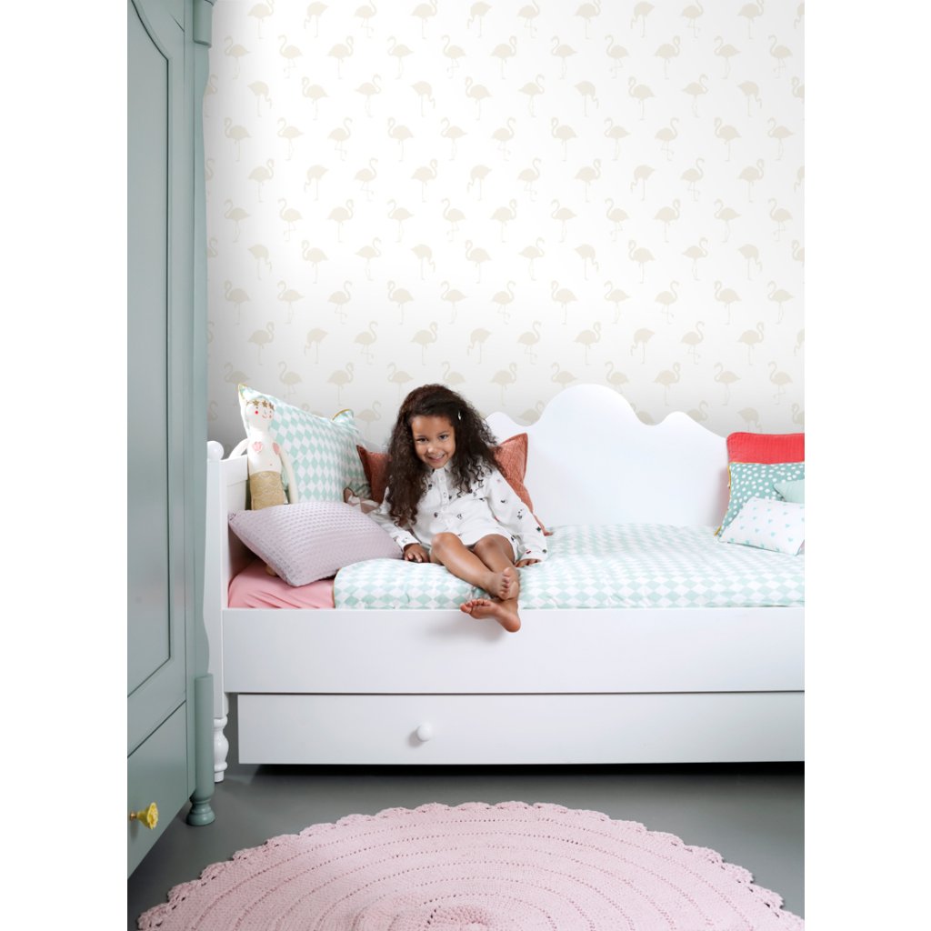 Už ste niekedy videli niečo rozkošnejšie? Táto sladká tapeta s plameniakmi v striebornej a bielej farbe vnáša do miestnosti príjemnú, veselú a živú atmosféru. Popustite uzdu svojej fantázii a predstavivosti vášho dievčatka a vytvorte fantastickú dievčenskú izbu, kde môžete snívať a hrať sa.